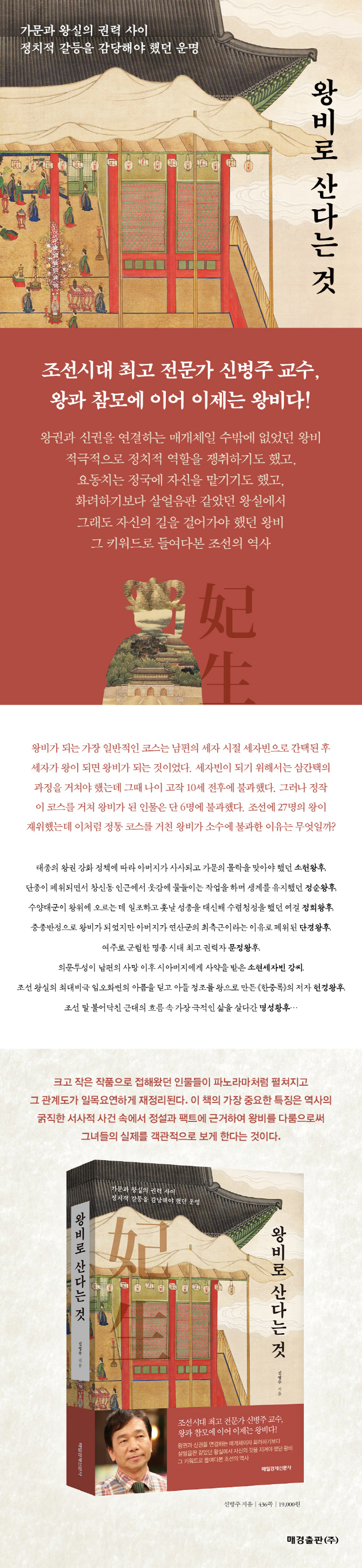 그동안 ‘왕’과 ‘참모’라는 키워드로 조선시대를 다루었다면 이제는 ‘왕비’라는 키워드로 조선시대를 들여다보자. 같은 조선시대이지만 왕비를 중심으로 살펴볼 때 《왕으로 산다는 것》과 《참모로 산다는 것》에 등장하지 않았던 또 다른 측면이 보인다. 야록, 설화 등 신변잡기적 내용으로 접했을 법한 이야기를 조선시대 최고 전문가 신병주 교수를 통해 《조선왕조실록》에 근거한 팩트로 살펴보는 기회가 될 것이다. 드라마, 영화 등 사극의 대부분이 궁중을 중심으로 이루어지는 만큼 사소한 배경과 인물 관계도, 명칭까지 이 《왕비로 산다는 것》을 읽으면 이해가 쉽다. 크고 작은 작품 속 인물들이 파노라마처럼 펼쳐지고 그 관계도가 일목요연하게 재정리된다. 무엇보다 이 책의 가장 중요한 특징은 굵직한 역사적 사건 속에서 정설과 팩트에 근거하여 왕비를 다룸으로써 그녀들의 실제를 객관적으로 보게 한다는 것이다.
