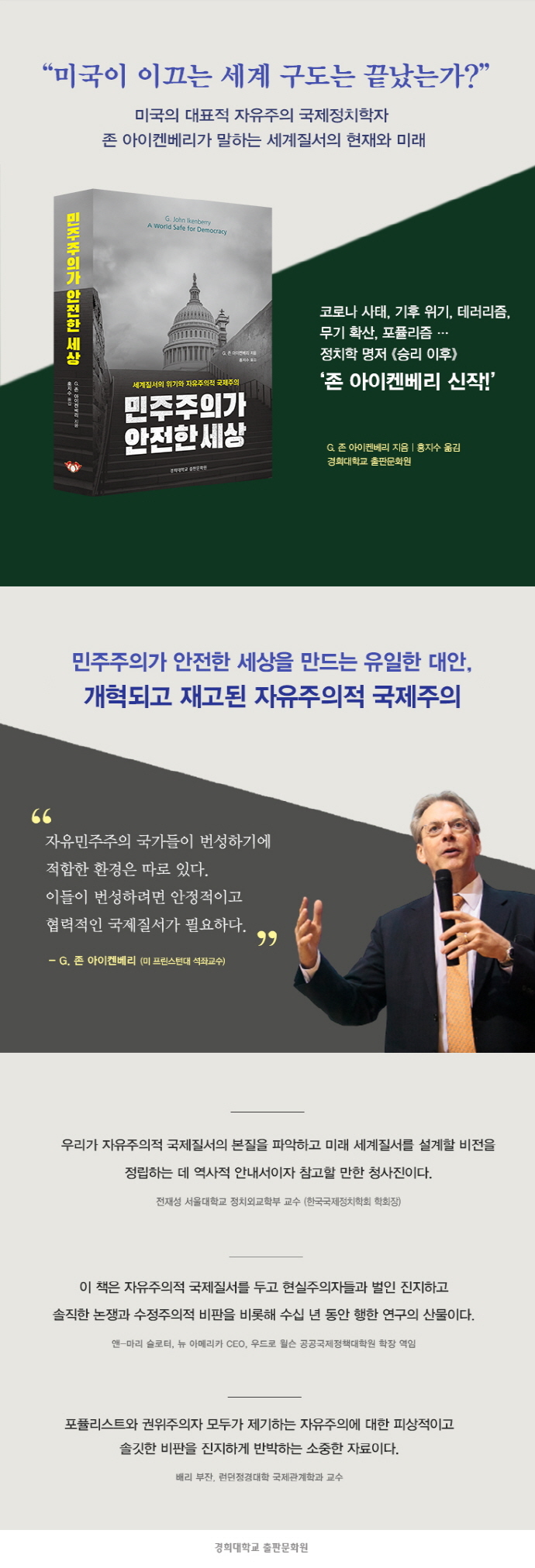 존 아이켄베리는 최근 국제관계론 학자를 대상으로 한 설문조사에서 지난 20년간 이 분야에서 가장 뛰어난 저작을 배출한 학자 10위, 5년간 가장 흥미로운 저작을 배출한 학자 8위에 올랐다. 슈뢰더-저비스상을 수상한 정치학 명저 《승리 이후》 등 자신의 여러 저서를 통해 자유주의적 국제질서야말로 역사상 예외적인 안정적이고 이상적인 질서이며, 자유민주주의 국가들을 축으로 역사를 진보하게 했다는 믿음을 대변해왔다. 《민주주의가 안전한 세상》에서는 자유주의적 국제주의가 19세기에 시작된 뿌리부터 오늘날 분산된 정치운동이 되기까지 걸어온 긴 여정을 온전히 살펴본다. 그는 지난 2세기 동안 수많은 격변을 겪으면서도 자유주의적 국제주의는 꾸준히 자유민주주의가 안전한 국제적 공간 조성, 국가 내에서 또 국가 사이의 권리와 사회보장 보호, 자유와 평등, 개방성과 사회적 연대, 주권과 상호의존성 같은 서로 모순되는 가치 간의 타협점 모색을 목표로 추진해왔다고 옹호한다. 그러면서 한편으로는 자유주의적 국제질서가 자유와 개방성을 내세우면서도 서구우월주의, 일방적인 문명관, 제국주의, 인종주의, 자본주의의 불평등 등과 시대적으로 결탁하기도 했다는 점을 동시에 인정하고 있다. 때에 따라 자유주의적 국제주의는 긍정적, 부정적 동반자들과 다양하게 결합하면서 자유주의 이념과 어긋나는 수많은 외교정책을 시행해온 사실을 균형 있게 평가하는 것은 이 책의 큰 장점이다. 또한 《민주주의가 안전한 세상》에서는 그동안 세계질서의 중심축으로 움직여온 미국이 이끄는 세계 구도, 앞으로의 변화, 어떠한 구상과 이념이 미래의 세계를 이끌어가야 하는지 등 세계질서의 현재와 미래를 논한다.