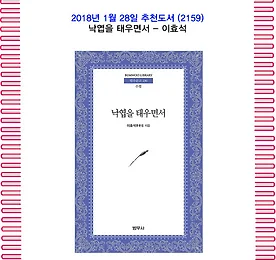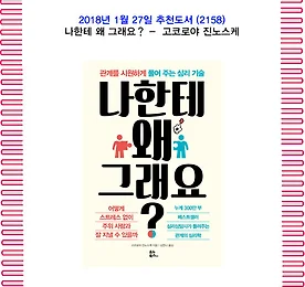 전체 글 썸네일형 리스트형 1월의 추천도서(2159) 낙엽을 태우면서 - 이효석 1. 책 소개 자연의 아름다움과 신비로움을 이효석의 필치로 만난다!《메밀꽃 필 무렵》의 작가 이효석의 수필집『낙엽을 태우면서』. 낙엽을 태우면서 느끼는 생활의 보람, 낙엽을 태우면서 느끼는 삶의 보람, 가을에 느끼는 삶의 보람, 낙엽을 태우면서 느끼는 삶의 의욕과 새로운 의미 발견한다. 이 책은 인간생활에 대해 성찰하기보다는, 자연의 아름다움과 신비로움을 환상적ㆍ서정적으로 그려내고 있다. 아울러 자연을 향한 친근감을 숨김없이 드러낸다. 특히 이효석의 작품은 관찰과 표현이 뛰어나며, 은유와 직유, 점층법을 적절히 구사하여 서정적이고 감상적인 맛을 더했다. 이국적인 정서가 반영되어 있고, 예시와 열거를 통한 표현, '나'의 행동과 상념의 전개가 연상적인 흐름에 따라 표현되고 있다.출처 : 교보문고 2. 저자.. 더보기 1월의 추천도서(2158) 나한테 왜 그래요? - 고코로야 진노스케 1. 책 소개 심리상담사가 들려주는 관계의 심리학!우리는 상대방과 의견이 부딪치거나 싸웠을 때 ‘그런 말을 하다니 기분 나쁘다’, ‘내 마음도 몰라주다니 화가 난다’, ‘매번 부딪치는 이런 상황이 싫다’ 등의 부정적인 감정을 느낀다. 그래도 마음 속 깊은 곳에서는 상대방과 사이좋게 지내고 싶은 욕망이 있다. 우리는 늘 원만한 인간관계, 서로 배려하는 인간관계를 만들기 위해 애쓴다. 그렇다면 어떻게 주위 사람들과 사이좋게 잘 지내 수 있는 것일까. 이 책 『나한테 왜 그래요?』는 《평생 돈에 구애받지 않는 법》, 《약해지지 않는 마음》, 《내가 제일 예뻤을 때》등으로 이름을 알린 심리상담사 고코로야 진노스케가 관계의 심리학에 대해 풀어낸 책이다. 우리가 관계 때문에 힘들어 하는 것은 사람들 사이에 갈등이 .. 더보기 이전 1 ··· 1290 1291 1292 1293 1294 1295 1296 ··· 2425 다음