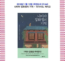 전체 글 썸네일형 리스트형 1월의 추천도서(2145) 나비 - 헤르만 헤세 1. 책 소개 꽃과 나비에 대하여 무상한 것, 덧없는 것의 상징으로서 깊은 애정을 가졌던 헤세의 여러 가지 체험과 추억, 관찰, 시 가운데서 매혹적인 것들만을 고른 것. -나비는 아무 것도 계획하지 않는다. 그것은 어디선가 흔들거리며 날아와 어디론가 날아간다. 휴식하는 동안 이따금 꿈틀거리며 꿀을 빨고 그러다가 잔잔한 바람에 밀려 높이 솟구쳤다 다시 새로이 유희적인 날개의 율동으로 내려앉는다. 바람처럼 신이 의도한 바로 그 순간처럼... 나비는 꽃에서 꽃으로 날아다니며 꿀도 모으지 않는 빈둥거리는 방랑자다. 지구는 큰 산맥과 코끼리, 얼음과 납을 지니어 힘있고 무거우며 거칠다. 그러나 나비가 없다면, 민들레의 돌부리가 없다면 견딜 수 없을 것이다. 단 한 마리의 나비는 지구의 무게를 지양한다. 무거운 모.. 더보기 1월의 추천도서(2144) 나미야 잡화점의 기적 - 히가시노 게이고 1. 책 소개 따뜻한 고민 상담실 ‘나미야 잡화점’으로 오세요!일본을 대표하는 소설가 히가시노 게이고의 신작 『나미야 잡화점의 기적』. 2012년 일본 중앙공론문예상 수상작으로, 작가가 그동안 추구해온 인간 내면에 잠재한 선의에 대한 믿음이 작품 전반에 녹아 있다. 오래된 잡화점을 배경으로, 기묘한 편지를 주고받는다는 설정을 통해 따뜻한 이야기를 들려준다. 30여 년간 비어 있던 오래된 가게인 나미야 잡화점. 어느 날 그곳에 경찰의 눈을 피해 달아나던 삼인조 도둑이 숨어든다. 난데없이 ‘나미야 잡화점 주인’ 앞으로 의문의 편지 한 통이 도착하고, 세 사람은 얼떨결에 편지를 열어본다. 처음에는 장난이라고 생각하던 세 사람은 어느새 편지 내용에 이끌려 답장을 해주기 시작하는데…. - 2012년 제7회 일본 .. 더보기 이전 1 ··· 1297 1298 1299 1300 1301 1302 1303 ··· 2425 다음