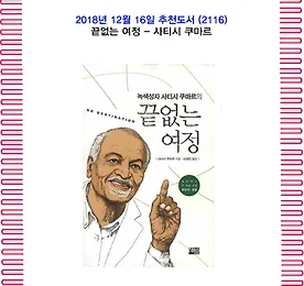 전체 글 썸네일형 리스트형 12월의 추천도서(2116) 끝없는 여정 - 사티시 쿠마르 1. 책 소개 생명평화운동을 전 생애를 통해 실천해온 사티시 쿠마르의 감동적인 삶의 여정을 그려낸 책. 사티시 쿠마르는 생태적 사고와 전통문화, 그리고 자연의 지혜를 탐색하는 격월간 잡지《리서전스》를 편집하고 발행하면서, 명상하고 산책하는 삶을 통해 주변 사람들에게 간디 식 평화와 공존의 이념을 전파해왔다. 또한 어린이를 위한 ‘작은학교’와 성인을 위한 ‘슈마허 대학’을 설립하여 세계적으로 인정받는 대안학교로 만들어 놓았다. 이 책에는 사티시 쿠마르가 비폭력과 생태적 영성을 추구하는 과정에서 만나게 된 수많은 사람들이 나온다. 비노바 바베를 비롯하여 인도 현지에서 만난 여러 구루들, 크리슈나무르티, 버트런드 러셀, 마르틴 루터 킹, E. F. 슈마허, 반다나 시바 등 모두 한 시대를 풍미한 세기의 지성들.. 더보기 12월의 추천도서(2115) 끝없는 추구 - 덱스터 예거 1. 책 소개 성공을 부르는 30가지 습관을 담은 책. 실패와 성공의 경험을 통해 자신이 무슨 말, 어떤 행동을 해야 하는지 잘 알고 있는 최고의 위치에 오른 사람들의 성공 습관을 통해 성공에 한걸음 나아갈 수 있도록 안내한다.출처 : 교보문고 2. 저자 사업가이자 백만장자인 덱스터 예거는 미국에서 가장 영향력 있는 리더 중 한명으로 “그 누구에게도 당신의 꿈을 빼앗기지 말라”등 8권의 베스트셀러작가이며 돈의 관리와 재정적 성공이란 주제로 자주 강연을 하며 자신의 성공과 자기가 주는 조언이 일치하는 몇 안 되는 동기부여가 이다 출처 : 교보문고 3. 목차 헌사 머리말 제1장 우리를 통제하는 제1요소 제2장 자유, 이보다 더 좋을 순 없다 제3장 자영업은 전 세계의 희망이다 제4장 자신의 모습을 찾아라 제.. 더보기 이전 1 ··· 1312 1313 1314 1315 1316 1317 1318 ··· 2425 다음