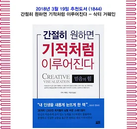 전체 글 썸네일형 리스트형 3월의 추천도서 (1844) 간절히 원하면 기적처럼 이루어진다 - 삭티 거웨인 1. 책 소개 간절히 믿고 원하면 이루어진다!믿음의 힘을 이야기하는 자기계발서『간절히 원하면 기적처럼 이루어진다』. 10년 동안이나 정신과 치료를 받던 저자 삭티 거웨인은 서른 살이 되던 해 자신의 경험을 바탕으로 책을 펴냈다. 내면의 두려움과 불안, 갈등과 같은 문제들을 해결하는 방법을 소개하는 이 책은 초판 출간 이후 20년이 넘도록 많은 사랑을 받으며 1,000만 부 이상 판매되었다. 저자는 심리학과 명상의 원리를 바탕으로, 마음을 잘 다스려 진정으로 원하는 것에 이르는 실제적인 방법을 제시한다. 짧고, 단순하며, 실용적이고, 바로 응용할 수 있는 효과적인 기법을 담고 있다. (개정판)출처 : 교보문고2. 저자 삭티 거웨인은 25년 이상을 베스트셀러 저자이자 전 세계적으로 의식분야를 이끌어온 전문가.. 더보기 3월의 추천도서 (1843) 간절함이 답이다 - 윤태익 1. 책 소개 『간절함이 답이다』라는 제목 속에는 '세상의 모든 일은 간절한 만큼 이루어진다.'는 평범한 진리가 담겨 있습니다. '간절함'이 어떠한 원리에 의해 작동이 되며, 또한 우리가 원하는 '답'이 어떠한 과정을 통해 이루어지는지에 대한 실천 메커니즘을 과학적으로 증명하고자 하였습니다. 한마디로 '소원성취 법'에 대한 비밀을 이책을 통해 알려드리고자 합니다. 출처 : 교보문고 2. 저자 경영학 박사, 인하대학교 겸임교수, 윤태익 人경영연구소, 행복한 가정생활연구소 소장이며, 에니어그램코리아 회장이다. KBS, MBC, SBS 등 주요 방송을 통해 사람의 성격과 의식을 토대로 한 교육컨설팅과 국내외 유수의 기업에서 경영컨설팅을 하고 있다. 또한, 부모와 자녀를 위한 청소년 자기계발 프로그램인 ‘황금나.. 더보기 이전 1 ··· 1458 1459 1460 1461 1462 1463 1464 ··· 2423 다음