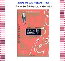 전체 글 썸네일형 리스트형 1월의 추천도서(1789) 호모 노마드 유목하는 인간 - 자크 아탈리 노마드(nomad)는 '유목민', '유랑자'를 뜻하며 프랑스의 철학자 들뢰즈는 노마드의 세계를 '시각이 돌아 다니는 세계'라고 묘사하면서 현대 철학의 개념으로 자리잡은 용어이다. 노마디즘(nomadism)은 현대로 들어오면서 그 의미가 확대되어 '공간적인 이동만을 가리키는 것이 아니라, 버려진 불모지를 새로운 생성의 땅으로 바꾸는 것, 한 자리에 머물며 특정한 가치와 삶의 방식에 매달리지 않고 끊임없이 자신을 바꾸어 가는 창조적인 행위'를 뜻하게 되었다. 21세기는 흔히 신 유목의 시대 또는 디지털 노마드 시대라고 부른다. 디지털 노마드란 정보기술을 갖추고 지구를 떠도는 시대를 상징한다. 자원이 부족한 한국사회에서 이러한 시대의 흐름을 읽는 것은 필수불가결하다. 호모 노마드는 현실에 머무르지 않고 파괴와.. 더보기 1월의 추천도서(1788) 호모루덴스 - 요한 하이징아 인류의 모든 문화 현상의 기원을 ‘놀이’에 두고 예술사와 종교사 등 인류 문명에 관한 다양한 학문을 도입하여 인류의 문화를 놀이적 관점에서 고찰하고 있다. 인간의 존재와 행위 양식의 본질을 파헤치면서 놀이가 오늘날의 문화에 어떤 기여를 했는지를 심층적으로 탐구하고 있다. 책에 따르면 놀이는 문화의 한 요소가 아니라 문화 그 자체가 놀이의 성격을 가지고 있다고 한다. 이 책의 저자 하위징아는 모든 형태의 문화는 그 기원에서 놀이의 요소가 발견되고 인간의 공동셍활 그 자체가 놀이형식을 가지고 있었으며, 철학, 시, 예술 등에도 놀이의 성격이 존재한다고 밝히고 있다. 즐거움과 흥겨움을 동반하는 가장 자유롭고 해방된 활동, 삶의 재미를 적극적으로 추구하는 활동인 놀이가 법률, 문학, 예술, 종교, 철학을 탄생시.. 더보기 이전 1 ··· 1487 1488 1489 1490 1491 1492 1493 ··· 2423 다음