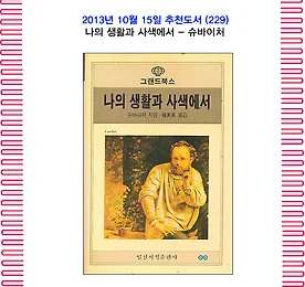 전체 글 썸네일형 리스트형 10월의 추천도서(230) 나의 인생 나의 학문 - 김원용 책소개 기차를 타고 산을 돌다가 물이 보이고 바위가 있고 진달래 꽃이 바위 틈에 피고 있으면 행복의 탄성이 입에서 절로 나온다. 이러한 행복감은 사람만이 가질 수 있는 자연의 아름다움에 대한 이해요. 감상력이다. 자연의 아름다움에는 생명의 기쁨을 느끼게 하는 자연의 근원적 아름다움이 있다. -행복의 미학중에서- [인터파크 도서 제공] 목 차 책을 펴내면서·안휘준 제1장 노학생의 향수 나의 자화상 원남동 추억 내가 받은 교육 경복궁 식탁기 나와 문인화 금주명도 삼불암 주인 부부 나의 친구 나 혼자만의 즐거움 아내의 첫 나들이 인생, 행복의 음미 나의 애장품 나의 법당 유서 봉투 병상에 누워 허무한 이 세상 하루하루 제2장 하루 하루와의 만남 이석암 빗소리를 들으며 생선·바다·지석묘 향나무판의 사연 대머리 .. 더보기 10월의 추천도서(229) 나의 생활과 사색에서 - 슈바이처 저자소개 슈바이처 의사이자 신학자, 음악가인 슈바이처는 프랑스 알자스(당시 독일지방)의 카이저스베르크에서 목사의 아들로 태어났다. 스트라스부르 대학에서 신학과 철학을 전공하며, 고통 받는 사람들이 많은 이 세상에서 자신이 누리는 행복이 과연 당연한 것인가에 대해 고민하던 그는 21세에 중대한 결심을 햇다. 30세까지는 학문과 예술을 전공하고, 그 후부터는 인류에 봉사하는 삶을 살겠다는 것이다. 철학과 신학 박사 학위를 받고 나서 그는 스트라스부르 대학부 교수이자 성 니콜라이 교회 목사로 봉직하다가 29세에 아프리카 선교 봉사 인력이 부족하다는 기사를 보고 아프리카로 갈 것을 결심했다. 그래서 30세라는 늦은 나이게 의대에 들어갔다. 1914년 그는 부인 헬레네와 함께 아프리카 랑바레네로 향했다. 그리고 .. 더보기 이전 1 ··· 2297 2298 2299 2300 2301 2302 2303 ··· 2417 다음