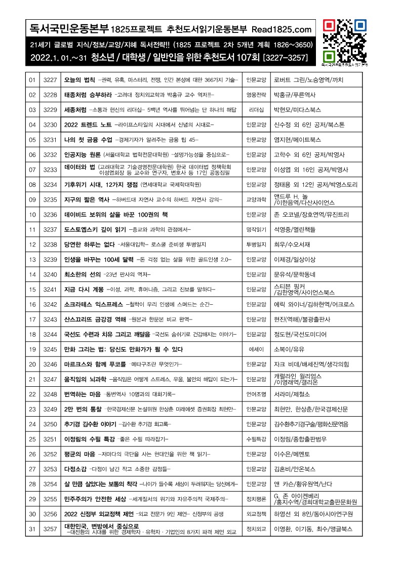| 청소년 · 대학생 · 일반인을 위한 추천도서 (108) (2022.2) (0) | 2022.02.01 |
