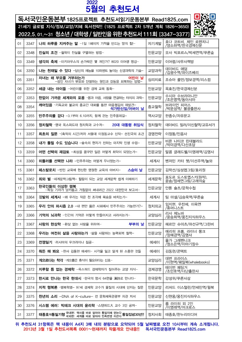 | 청소년 · 대학생 · 일반인을 위한 추천도서 (112) (2022.6) (0) | 2022.06.01 |