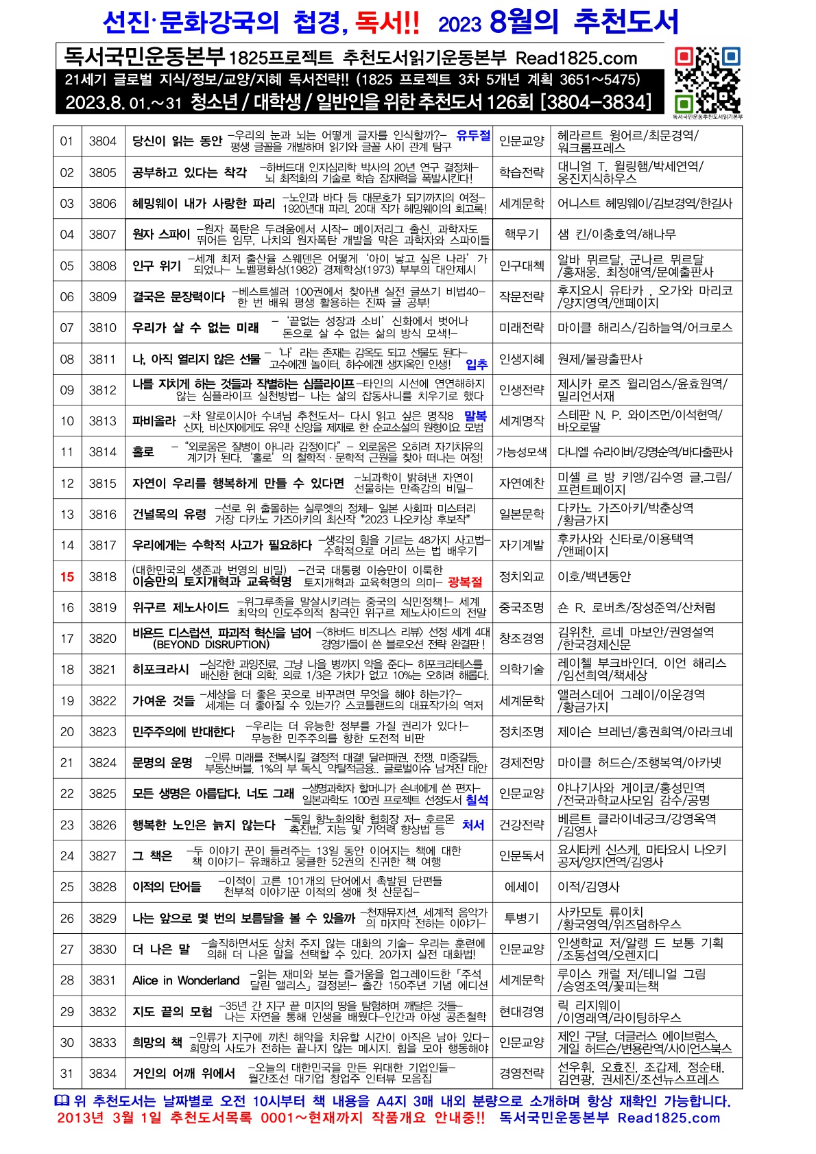 | 청소년 · 대학생 · 일반인을 위한 추천도서 (127) (2023.09) (0) | 2023.09.01 |