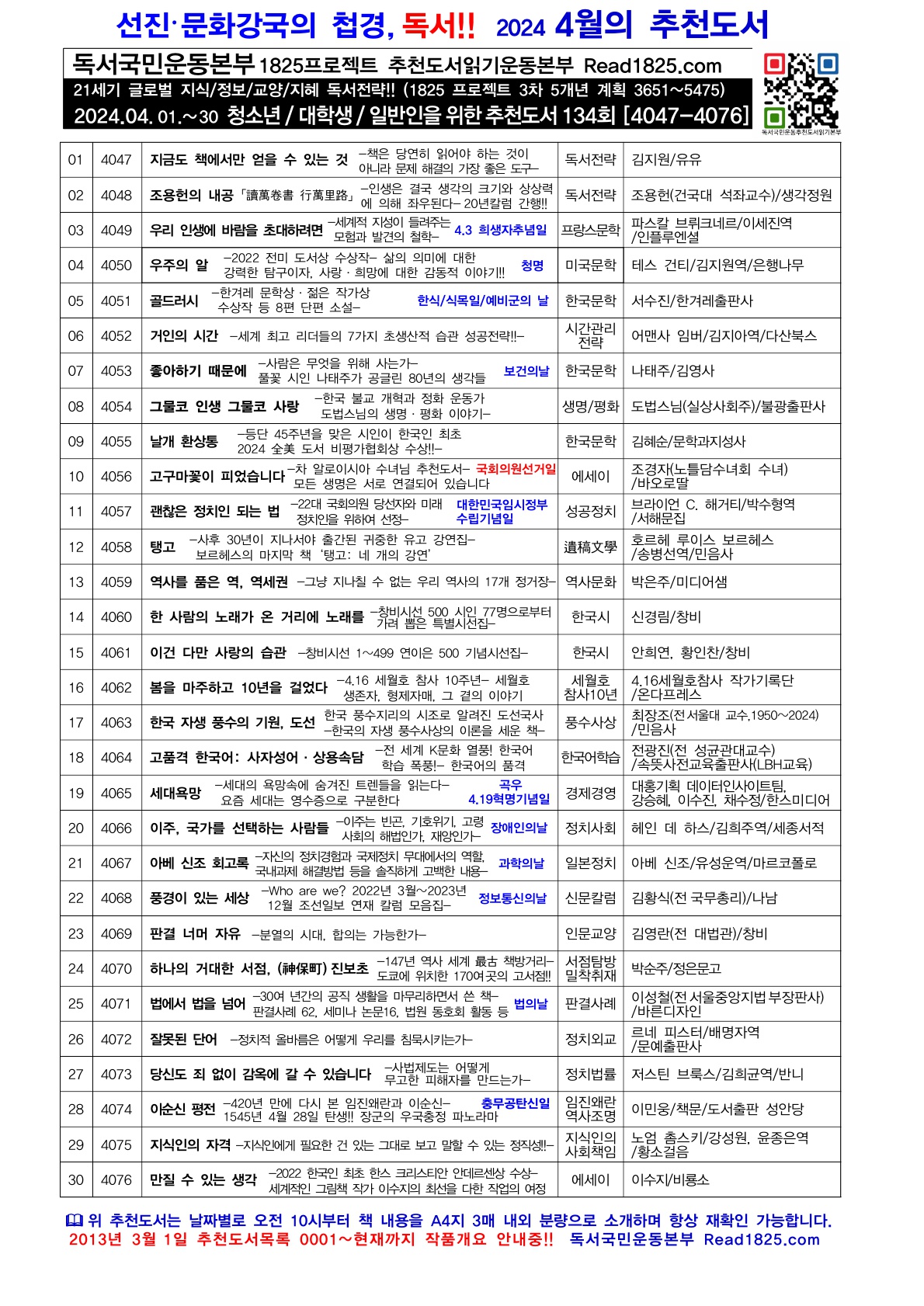 | 청소년 · 대학생 · 일반인을 위한 추천도서 (135) (2024.05) (0) | 2024.05.01 |