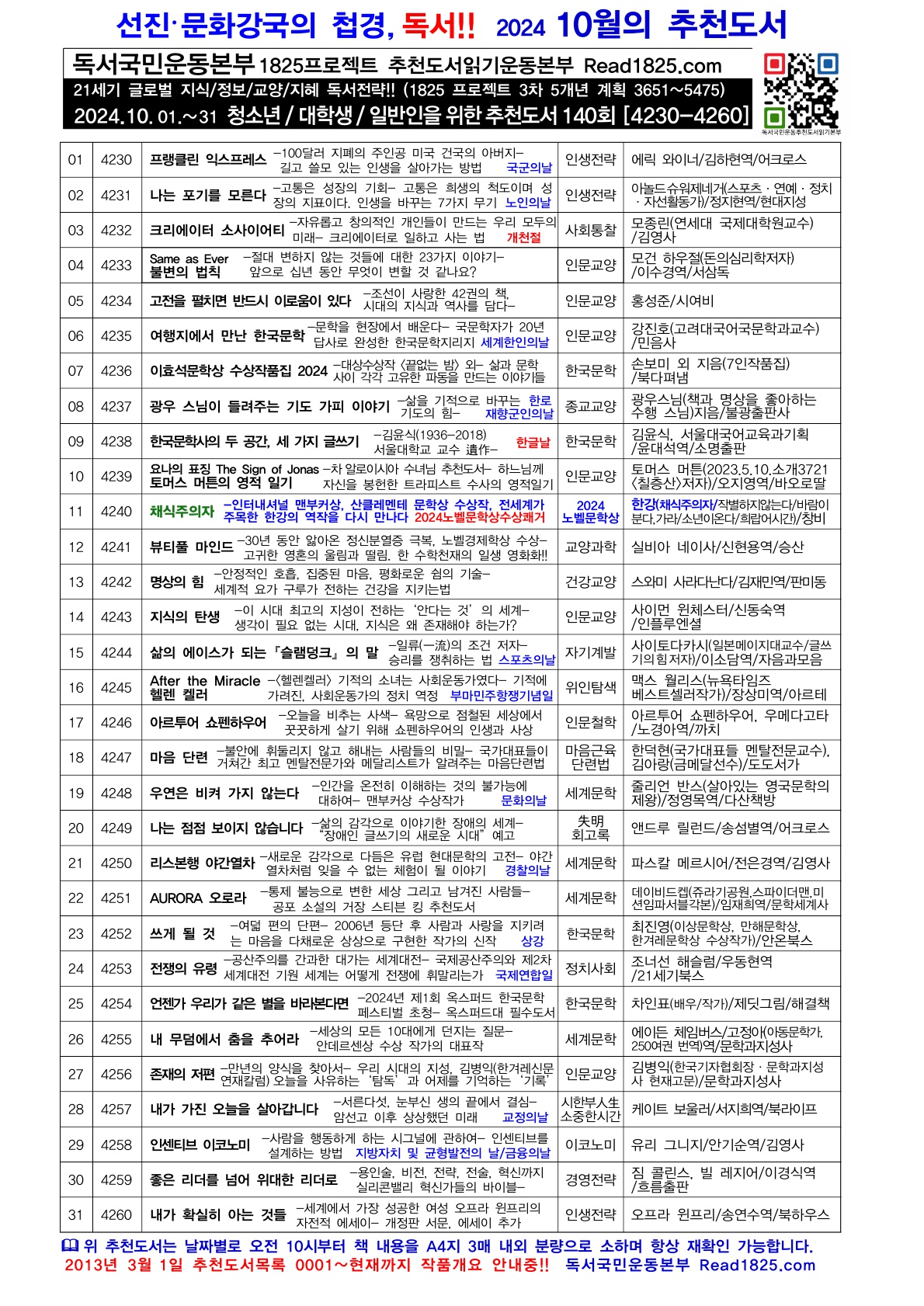 | 청소년 · 대학생 · 일반인을 위한 추천도서 (141) (2024.11) (1) | 2024.11.01 |