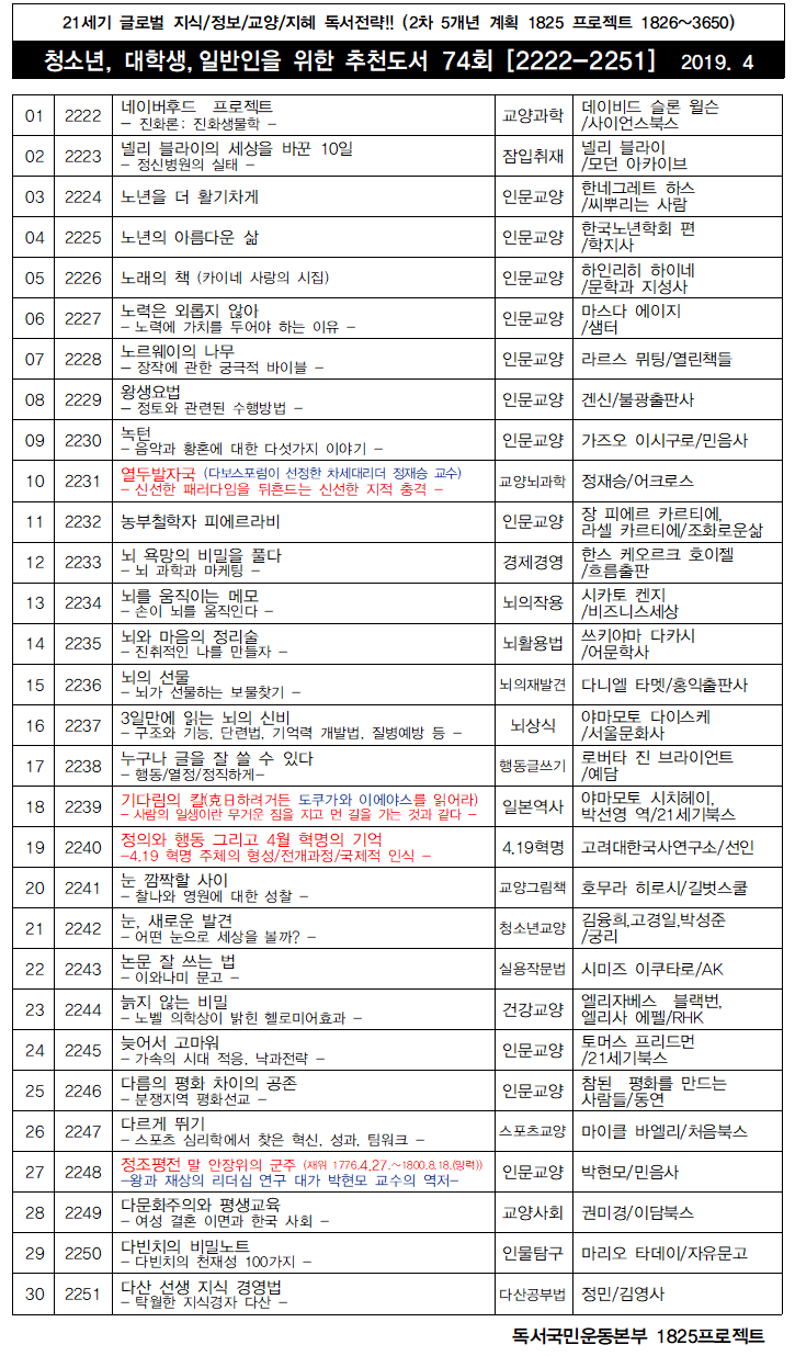| 청소년 · 대학생 · 일반인을 위한 추천도서 (76) (2019.6) (0) | 2019.06.01 |