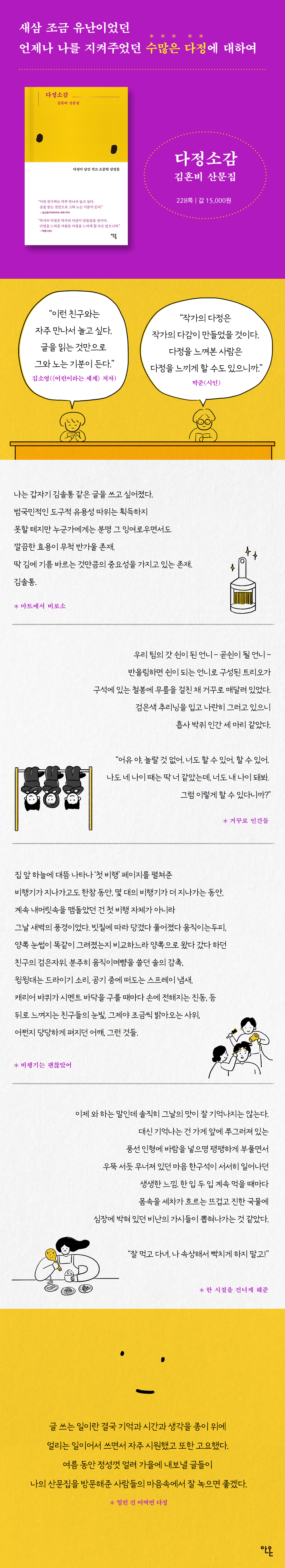 김혼비는 지금의 김혼비가 되기 위해 그동안 얼마나 많은 마음을 묶었던 것일까. 또 얼마나 자주 이 마음을 풀어보았을까. 분명한 것은 작가의 다정은 작가의 다감이 만들었다는 것이다. 다정을 느껴본 사람은 다정을 느끼게 할 수도 있으니까. 큰 웃음소리를 가진 이가 가장 호쾌하게 선언할 수 있는 것처럼. 혹은 혼자 울며 숨죽였던 시간들이 먼 곳의 작은 울음에 귀를 기울이게 해주는 것처럼.