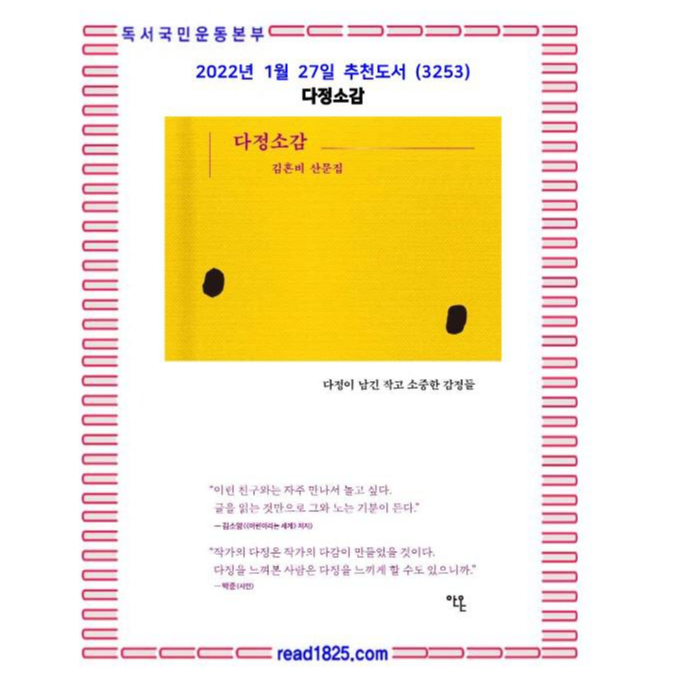 | 1월의 추천도서 (3254) 살 만큼 살았다는 보통의 착각 (0) | 2022.01.28 |