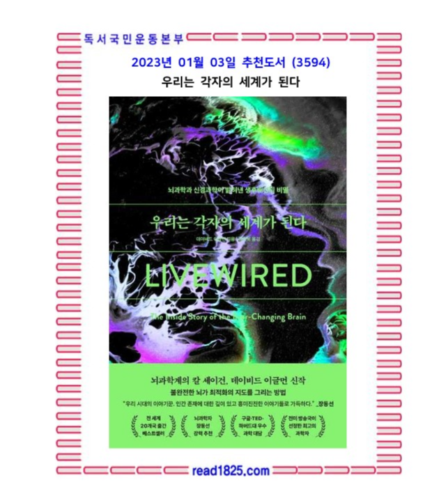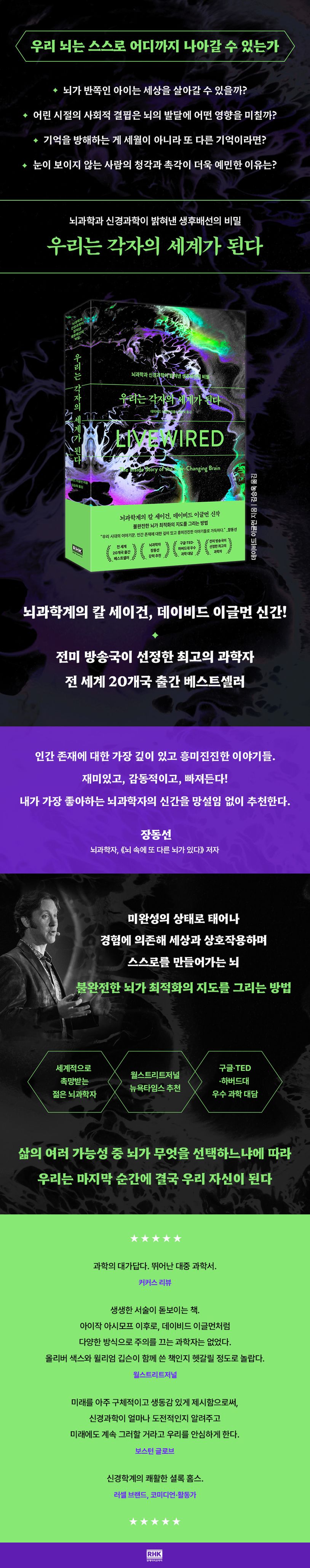 저자 데이비드 이글먼이 이 책에서 이야기하고자 하는 바는 한마디로 뇌의 무한한 가능성이다. 뇌 가소성은 신경학계에서 많이 쓰이는 말로, 이글먼은 플라스틱처럼 한번 형태가 잡히면 영원히 유지된다는 뇌 가소성이라는 용어에 한계를 느끼고 여기서 한 걸음 더 확장된 개념으로 ‘생후배선livewired’을 제시한다. 평생에 걸쳐 스스로를 바꿔나가는 뇌의 무한한 가능성을 한층 더 깊이 있게 들여다본 것으로, 바로 이 지점이 이 책의 차별점이다. ‘뇌에는 종점이 없다.’