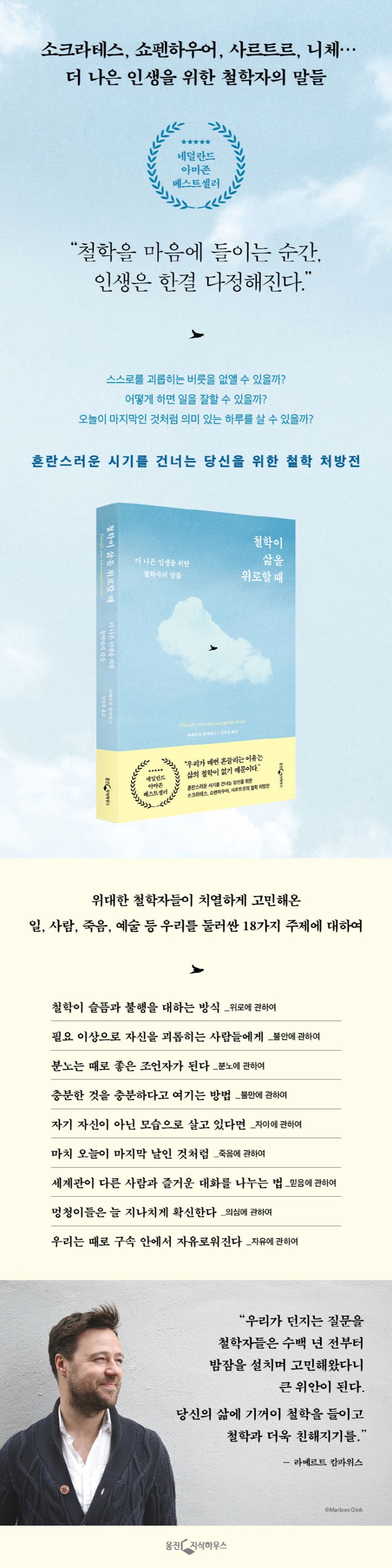 『철학이 삶을 위로할 때』는 현재 유럽에서 가장 활발하게 활동하는 젊은 철학자 라메르트 캄파위스가 펴낸 철학 저서 중 가장 큰 인기를 얻은 베스트셀러다. 철학, 문학, 대중문화를 종횡무진 오가는 이 책은 현재를 살아가는 우리의 인생과 수백 년 전 위대한 철학자들의 생각 사이에 다리를 놓아준다. 캄파위스는 일, 사람, 죽음, 예술처럼 우리를 둘러싼 것들을 비롯해 불안, 분노, 불만, 자아 등 내 안의 감정들까지 18가지 주제에 대해 철학자들이 어떤 관점을 지녔었는지를 흥미롭고 친절하게 알려준다. 저자는 “우리가 자신에게 던지는 질문을 철학자들은 이미 수백 년 전부터 밤잠을 설치며 고민해왔다니 큰 위안이 된다”고 말하며 우리가 인생의 어려움을 마주할 때마다 철학자들의 지혜를 빌리기를 권유한다. 저자에 따르면 철학이란 관점의 유연성을 훈련하는 것이며, 새로운 관점으로 인해 내 삶을 더 풍성하게 만들고, 스스로를 더 잘 보살필 수 있도록 사고력을 높여주는 최고의 방법이다. 이 책을 통해 우리는 나 자신과 타인, 그리고 나를 둘러싼 세상을 다르게 보는 방법을 배울 것이다.