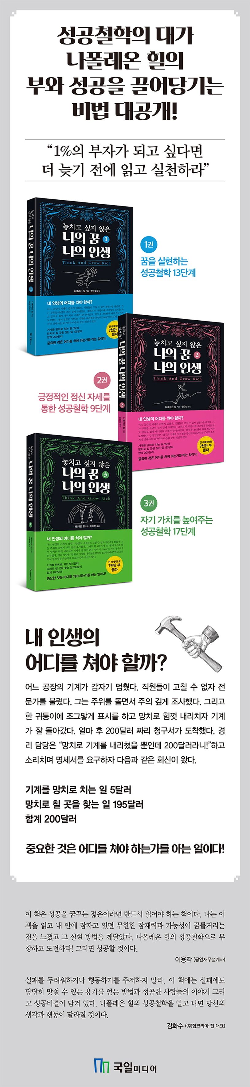 성공을 꿈꾸지만 어디서부터 시작해야 하는지 모르고 있고, 또 알지만 행동하지 못하고 주저하고 있는 사람들에게 나폴레온 힐의 성공철학은 그 틀을 깨고 나와 성공의 길로 가도록 인도해 줄 것이다.
