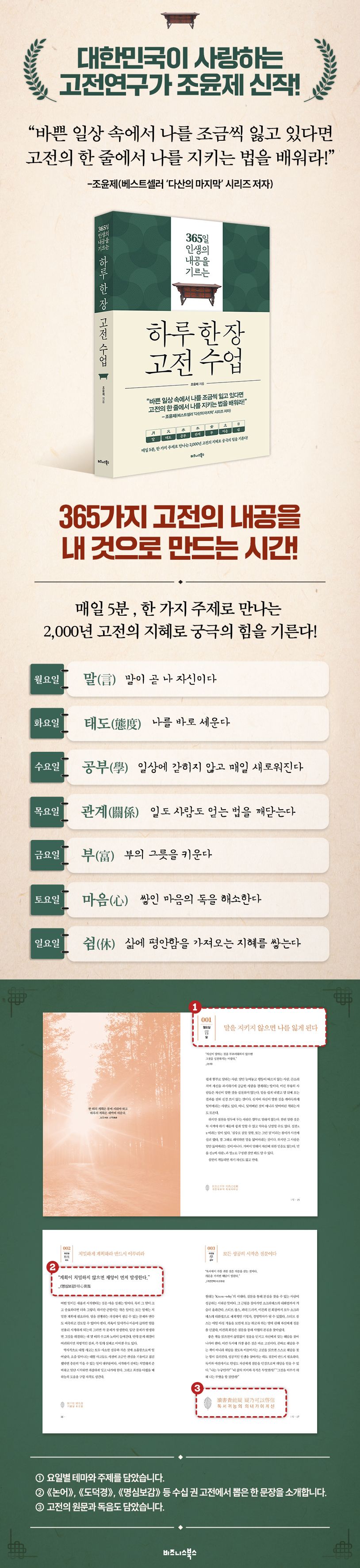7가지 주제를 보면 알 수 있듯이 고전은 삶의 모든 분야에 도움이 되는 지혜를 준다. 단순히 옛날이야기가 아니라 지금 이 순간에 가장 실천적이며 현실적인 도움을 주는 것이다. 1월부터 12월까지 저자가 제안하는 ‘아침 시간’이나 저녁, 자신만의 성찰 시간을 활용해 매일 한 문장씩 365개의 인생 내공을 만나 보자. 하루에 한 줄씩 읽고, 그 한 문장을 깊이 묵상하고, 자신의 일과 삶에 적용할 수 있는 지혜를 얻는 것을 제안한다. 그러면 1년 후, 흔들리지 않는 내면의 중심을 세우고 ‘앞으로 나는 어떤 가치와 마음으로 살아갈 것인가’에 대한 답을 반드시 찾을 수 있을 것이다.