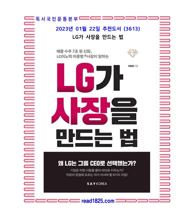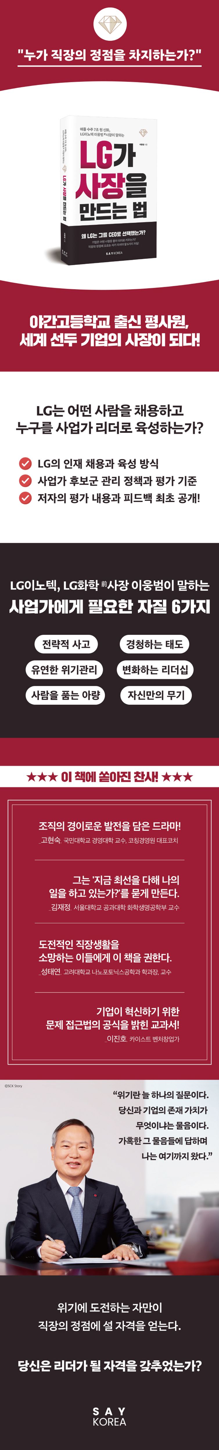이 책에는 이웅범이 CEO에 오르기까지 수없이 겪었던 위기상황과 그 대처방안, 효율을 최적화하는 운영의 노하우와 조직을 관리하고 남을 이끌어가는 리더십, 허를 찌르는 전략과 믿을 수 없는 성과가 오롯이 담겨 있다. 또 경영과 리더십 측면에서 통찰과 영감을 제공하는 LG의 혁신 사례를 비롯하여 LG의 인재 채용과 육성 방식, 그리고 이전까지 외부에 공개된 적 없는 CEO 후보군 관리 정책과 평가 내용을 이웅범이 직접 겪은 바를 통해 낱낱이 밝혀 두었다. LG뿐만 아니라 직장에서 일로써 성공하고자 하는 이들 모두에게 도움이 될 것이다.
