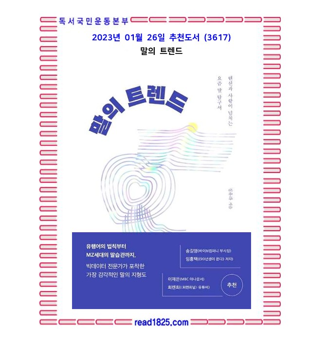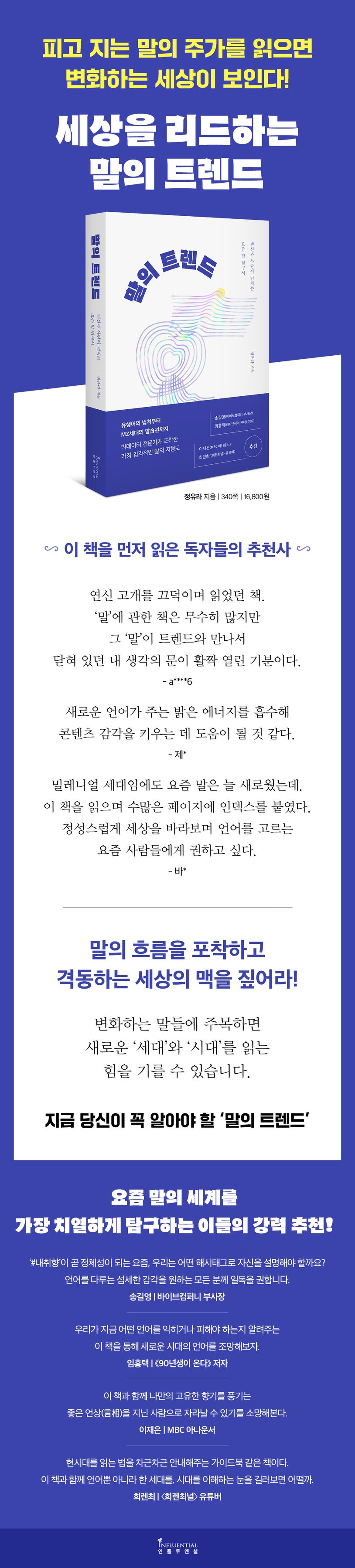 어제의 유행어가 오늘은 구설수가 되기도 하는 ‘말의 정글’에서 살아남으려면 어떻게 해야 할까? 아이폰보다 더 자주 업데이트되는 말의 감각을 따라가려면 ‘요즘 말’의 ‘지형도’를 읽는 눈이 필요하다. 이를 위해 빅데이터 분석 기업 ㈜바이브컴퍼니의 정유라 연구원이 쓴 《말의 트렌드》는 유행어의 꽁무니를 쫓는 것이 아니라, 새로운 말들의 세계를 파고들면서 그 심연에 있는 시대와 사람들의 변화를 읽는다. 유행하는 말들의 공통점, 새로고침이 한창인 말들의 현장, MZ세대의 언어 습관 등을 폭넓게 조망하는 이 책은 우리에게 가장 최신의 생생한 언어 감각을 선물할 것이다. 이제 우리의 언어 교과서는 국어책이 아니라 유튜브, 드라마, 커뮤니티, 카카오톡 등 손안의 일상이다. 말들이 살아 움직이는 전쟁터에서 ‘말의 트렌드’를 읽고 시대와 사람의 마음을 움직이는 힘을 길러보자.