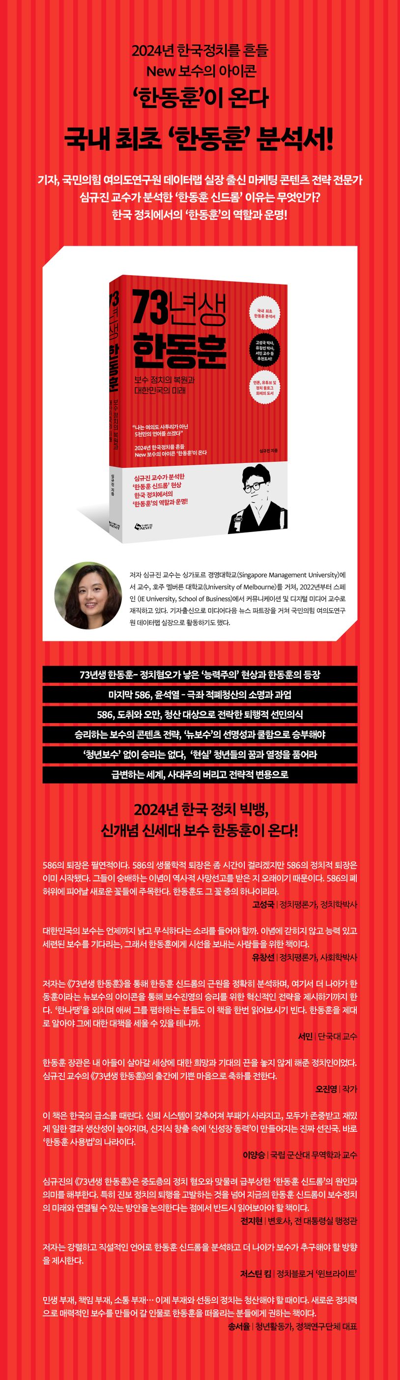 이러한 저자의 논리 구조는 〈73년생 한동훈〉이 단순한 정치 셀럽의 유명세에 편승한 홍보성 책이 아닌, 우리 사회의 통합과 발전을 고민하는 저자의 철학과 비전을 담은 사회 논평서로서의 가치를 더한다.