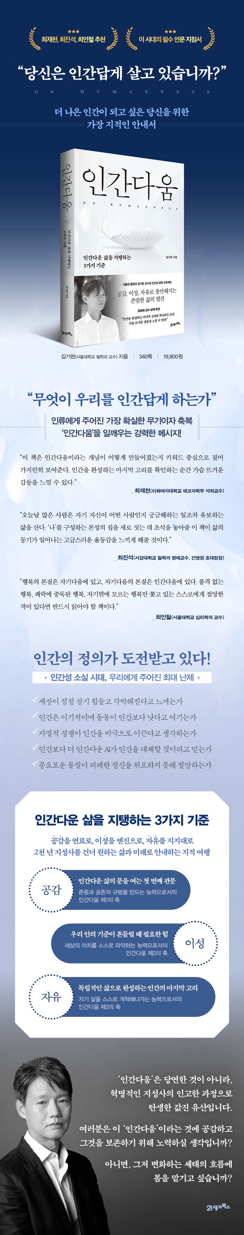 대한민국 인문학계를 대표하는 서울대학교 철학과 김기현 교수는 현대인이 ‘인간다움’에 대한 인지부조화를 겪고 있다고 진단하며, 이처럼 가치관과 이념이 대립하고 갈등할수록 우리가 속한 사회의 물리적 측면뿐 아니라 정신적 측면에도 관심을 기울여야 한다고 강조한다. 오늘날 사람들의 관심이 환경의 변화나 경제적 측면에 쏠려 있는 반면, 인간의 내면세계에 대한 관심은 상대적으로 빈약하다는 것이 그의 지적이다. 이 책은 거대한 변화의 급류 한가운데 서 있는 우리가 원하는 미래에 도달하기 위해서는 더 늦기 전에 내면세계, 즉 인간을 인간답게 하는 요소가 무엇으로 구성되어 있고, 어떻게 변화하고 있는지 살펴볼 것을 권한다.