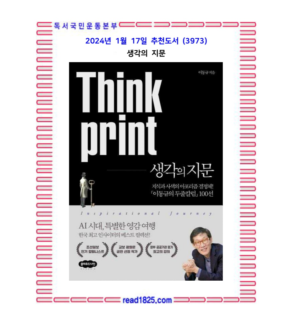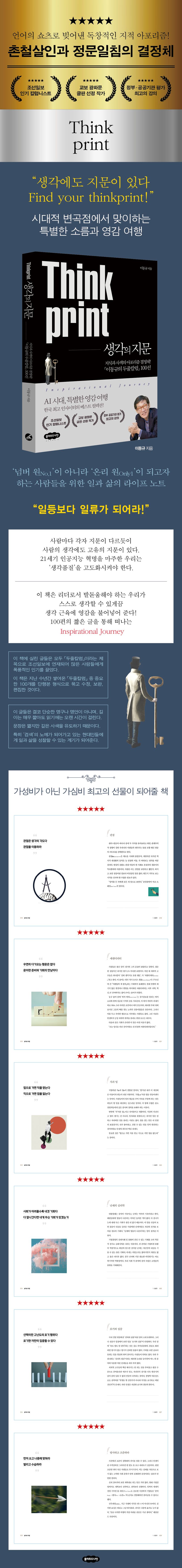 가장 중요한 것은 각자의 ‘생각품질’을 높이고 자신만의 목소리를 내는 일이다. 이 책을 읽는 모든 독자들은 인간만의 특별한 ‘영감 여행(Inspirational Journey)’을 떠나는 유쾌한 기분과 함께 자신만의 유니크한 생각근육을 키우고 마음의 울림을 느끼게 될 것이다. 나아가 위대한 인간정신의 최종 병기인 3력(力), 즉 창의력·상상력·공감력의 새로운 지평을 여는 계기가 될 것이다.
