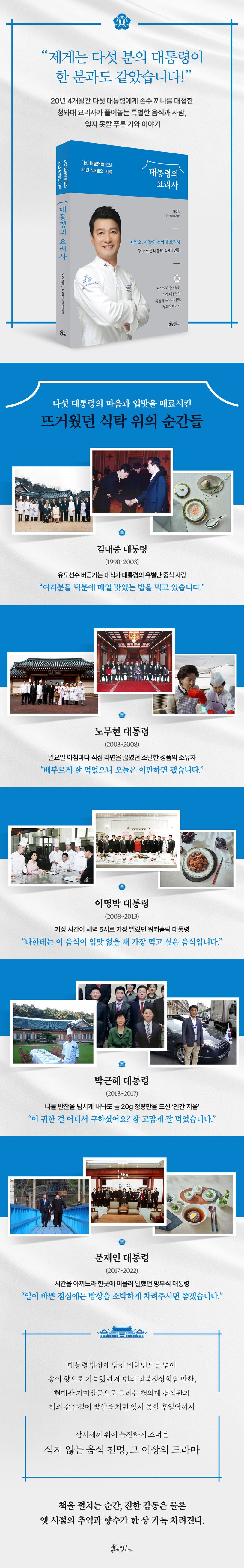 기본적으로 대통령 한 분의 임기 동안 차려야 하는 밥상만 대략 5천 끼 이상, 여기에 다양한 규모와 형식의 만찬들까지, 요리사로서 국가 원수의 식탁을 책임진다는 것은 참으로 힘든 일이 아닐 수 없다. 사계절 메뉴에 대한 장기적인 고민부터 건강 상태까지 고려해야 하고, 혹시 모를 위험에 대비해 한시도 긴장을 늦출 수 없기 때문이다. 개인적인 시간과 휴가조차 마음껏 허락되지 않는다. 하지만 그는 타고난 감각과 뚝심으로 2018년 청와대를 떠날 때까지 김대중, 노무현, 이명박, 박근혜, 문재인에 이르는 다섯 대통령의 삼시세끼를 책임지며 음식을 준비했다. 그리고 겹겹의 세월 속에 마주했던 대통령들의 인간적인 면면, 도전과 위기의 순간마다 손을 모았던 동료들, 또 든든한 지원군이 되어준 가족, 음식 이야기를 한 권의 책으로 탄생시켰다. 긴 세월 모든 대통령을 묵묵히 마음을 다해 모셨던 그날이 있었기에, ‘최연소’, ‘최장수’, ‘최고의’ 청와대 요리사라는 명장의 타이틀을 지금까지도 유지하고 있다.