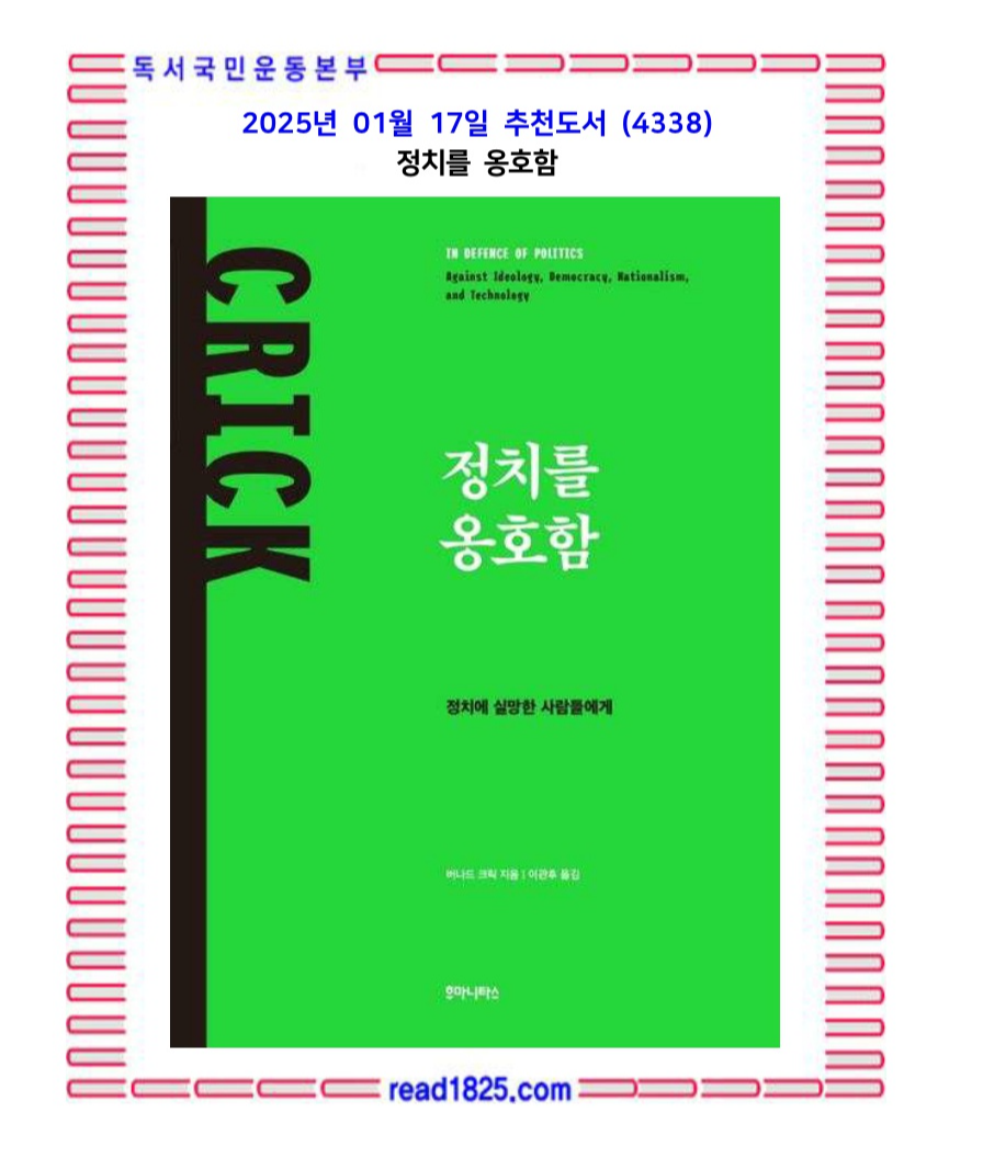 1962년에 처음 출간된 이래로 네 차례 개정을 거쳐 60년이 넘는 오늘날에도 여전히 영국 일반 가정집의 책장에 꽂혀 있는 이 책은 장구한 시간이 흘렀음에도 여전히 정치란 무엇인가에 대한 질문에 해답이 되고 있다. 이 책은, 좌우 이념 갈등이 치열히 벌어졌던 냉전 한복판에서, 정치를 어느 하나의 이데올로기나 이념적 잣대로 환원하려는 시도에 맞서, 또한 과학기술과 관료제의 놀라운 발전과 더불어 정치를 행정으로 치환하려는 시도에 맞서, 그 어느 하나의 본질로 환원되지 않는 정치의 독특한 특성을 밝히며, 위대하고 개명된 인간의 ‘행위’로서의 정치에 대한 신뢰를 회복하기 위해 힘쓴다.