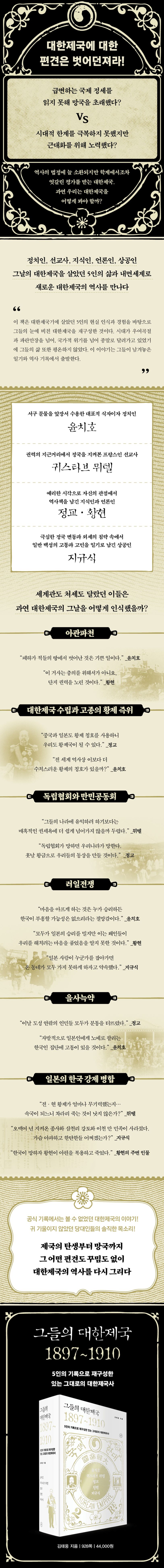 저자는 ‘그들의 대한제국’을 재구성하는 과정에서 대한제국의 역사를 연대기적으로 서술함으로써 책에 통사적인 면모를 부여한다. 한국 근현대사 연구자이자 대한제국사 전문가답게, 아관파천과 대한제국 수립에서 독립협회와 만민공동회 활동, 러일전쟁과 을사늑약, 헤이그 특사 파견과 군대 해산, 의병전쟁과 일제 강제 병합에 이르는 역사적 사건들의 맥을 차례로 짚어 나간다. 그리고 이러한 토대 위에 5인의 논평을 가감 없이 드러내고 직설적으로 평가함으로써 대한제국사의 주요 사건들을 더욱 선명하게 드러낸다. 이 책은 대한제국사(1897~1910)의 통사적 흐름과 주요 논점을 이해하고 싶은 독자에게 입문서로서 손색이 없을 것이다.