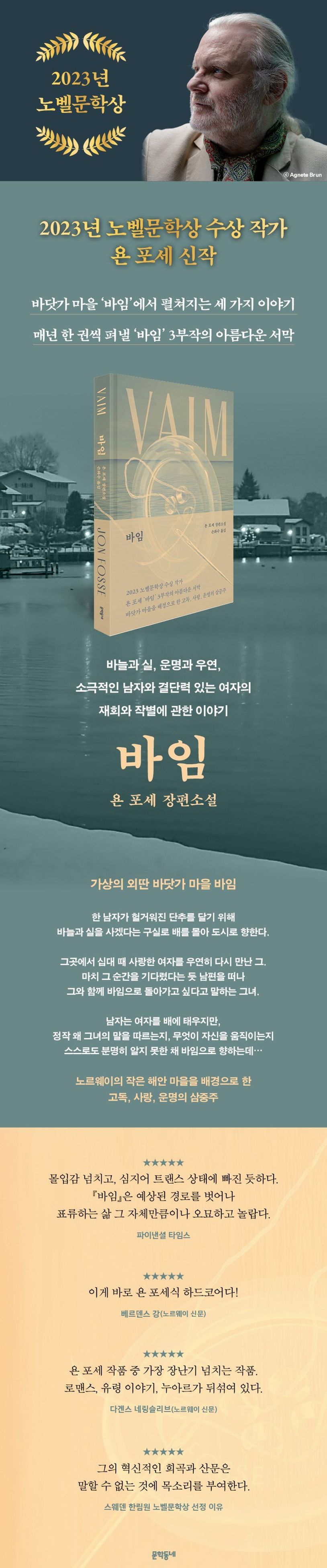 ‘바임’은 가상의 외딴 바닷가 마을 이름으로, 한 언론사 리뷰대로 익숙한 도플갱어 모티프로 격조 높은 “욘 포세식 하드코어”의 진수를 보여주는 로맨스 소설이다. 바임에 홀로 사는 우유부단하고 소극적인 표류자 같은 두 어부가 결단력과 단호함을 갖춘 한 여자와 만나 운명의 종착지로 삶의 배를 몰아가는 얘기다. 노르웨이 현지에서 활동하며 전작을 번역하기도 한 손화수 번역가는 욘 포세만의 문체와 호흡을 옮겨내고자 원고를 다듬고 또 다듬었고, 현지 에이전트를 통해 욘 포세에게 직접 「옮긴이의 말」 원고를 먼저 전달해 작가로부터 신뢰와 찬사를 얻어냄으로써 다른 해외판과 달리 욘 포세에게서 작가의 말을 이끌어냈다. (※ 한국어판 특이사항: 작가의 말 「한국의 독자 여러분께」 특별수록)