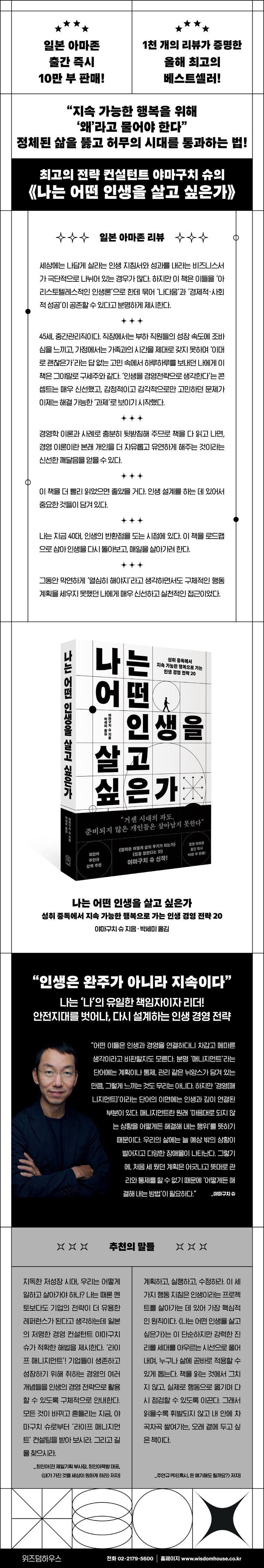 이번 신작 《나는 어떤 인생을 살고 싶은가》는 그의 사유가 한층 더 깊어진 결과물로 2025년 일본 아마존 출간 즉시 10만 부가 팔리면서 종합 베스트셀러로 자리 잡은, 올해 가장 화제가 된 책이다. 그는 더 이상 일이나 성공의 문제를 논하지 않는다. 대신 인생 그 자체를 하나의 ‘프로젝트’로 보고 마치 기업을 경영하듯 적절한 전략을 짜야 한다고 이야기한다. 광고기획자이자 경영 컨설턴트로 일해온 그가 자신의 전문 분야들을 신선하게 조합했다.