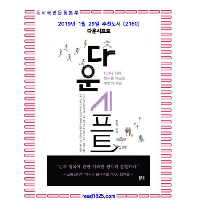 《다운시프트》는 이렇게 벼랑으로 내몰린 4050에게 현실을 넘어설 새로운 관점과 생각을 제공한다. 이른바 ‘행복경제학’이다. 저자는 삶의 속도를 늦추는 다운시프트를 결행하고, 소유(having)로부터 존재(being)로 가치의 프레임을 바꾸며, 자신이 하는 일을 즐기면서 즐거움과 기쁨 같은 긍정적 정서를 늘려 행복을 ‘만들라’고 제안한다.