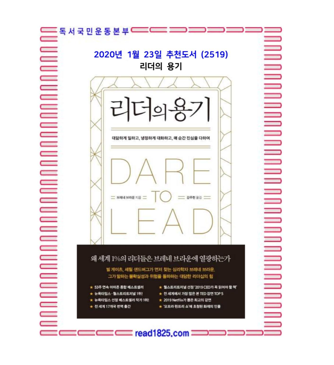 저자는 말한다. “대담한 리더십을 가진 리더는 결코 무너지지 않습니다. 실패를 경험하더라도 그 조직은 더욱 단단해지고, 하나가 되어 앞으로 나아갑니다. 아직도 강력한 카리스마, 완벽주의와 같은 옛날 리더십에 갇혀 있다면, 이제는 모든 리더들이 두려움을 마주할 용기를 내고 새로운 리더십을 보여줘야 할 때입니다.”
