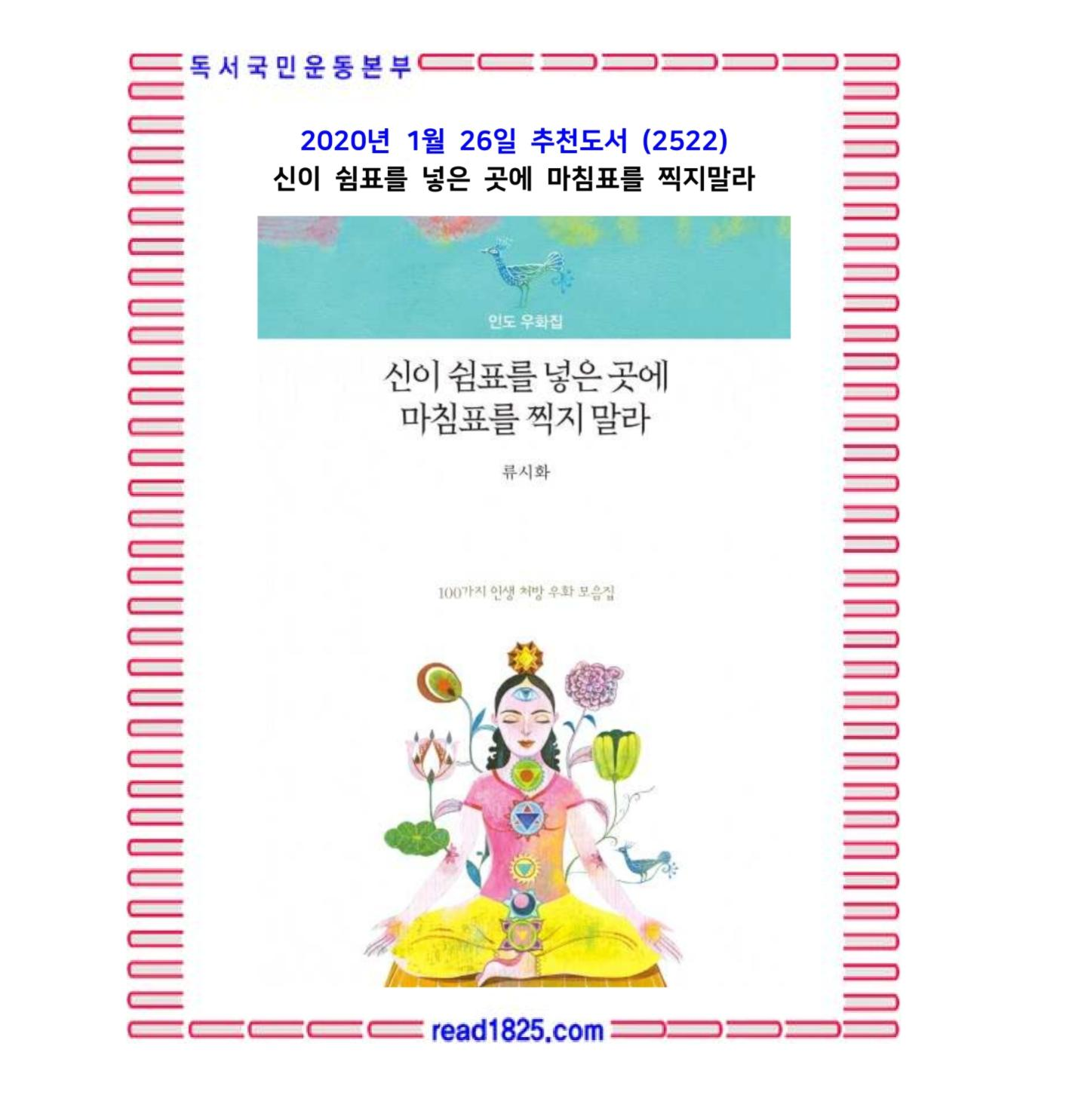 류시화 시인이 생의 절반을 인도를 여행하며 읽고 들은 우화와 설화, 신화, 그리고 실화를 담은 『신이 쉼표를 넣은 곳에 마침표를 찍지 말라』. 오랜 기간 저자가 엄선한 100편의 우화와 이야기들이 담긴 책으로, 우리 삶에 친숙한 동물들, 스승들, 왕들, 학자들이 인도 우화만의 독특한 화법으로 삶의 지혜와 진리를 전한다.