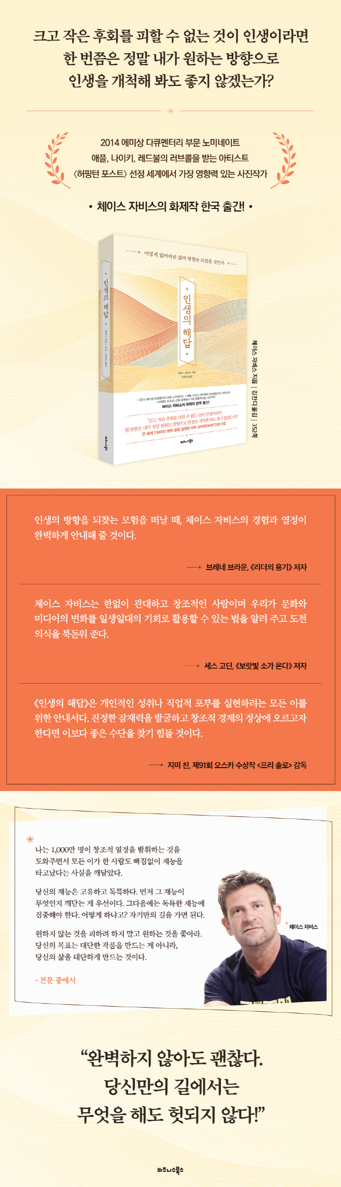 “우리 모두는 저마다의 창조성을 지니고 있다. 그리고 그 창조성을 세상에 인정받는 성공이 아니라 자신에게 의미 있는 성취를 창조하는 데 사용하라.” 《인생의 해답》이 전하는 메시지는 이 말로 요약할 수 있다. 저자는 평범한 의과대학 준비생에서 애플, 나이키, 레드불 등으로부터 러브콜을 받는 최정상의 사진작가이자 전 세계 1,000만 명이 넘는 수강생을 가진 온라인 교육플랫폼의 창업가가 되기까지 자신이 걸어 온 길을 소개하고, 잠재된 창조성을 끌어내는 4단계 원칙인 IDEA(Imagine-Design-Execute-Amplify)를 통해 독자들이 자신만의 인생의 방향을 찾도록 돕는다.