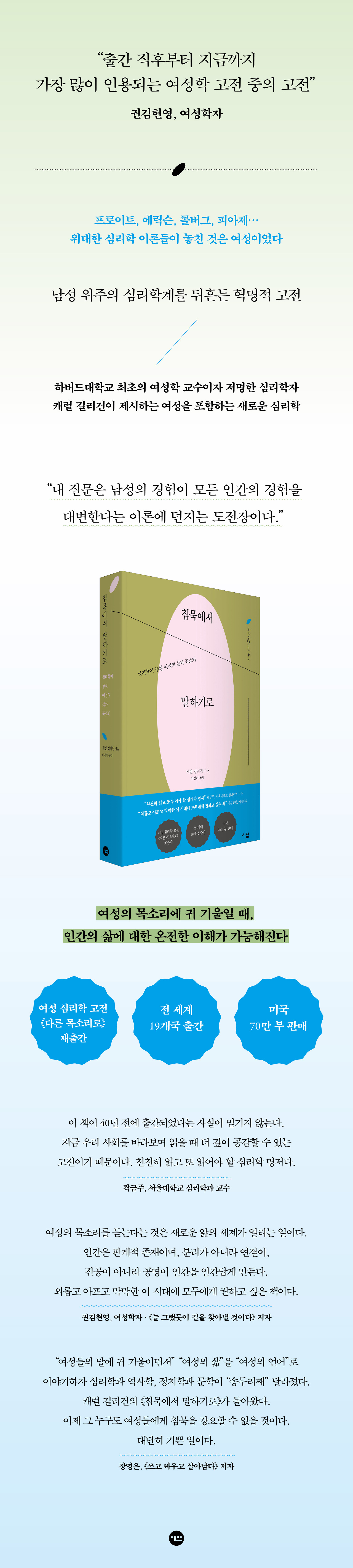 여성의 삶과 목소리를 포함하는 심리학의 탄생『침묵에서 말하기로』. 하버드대학교 최초의 여성학 교수이자 현재 뉴욕대학교에서 인문학 및 응용 심리학 교수로 재직하고 있는 캐럴 길리건은, 1970년대 초 콜버그와 함께 연구 조교로 일하며 그가 옹호하는 이론이 각 목소리의 특수성을 간과하고, 특정 관점이 구성되는 사회구조를 외면한다는 사실을 깨닫는다. 그는 여성의 말에 귀 기울여야 한다는 점, 심리 이론과 도덕 이론이 남성의 목소리에만 집중한 결과물이라는 점을 인식하면서 이 책을 썼다. 길리건은 이 책을 통해 프로이트, 에릭슨, 콜버그, 피아제 등 저명한 심리학자들과 그들의 이론이 여성을 지속적으로 배제해왔다는 사실을 지적하며, 직접 여성과 남성의 목소리를 듣고 관찰한 후 ‘돌봄의 윤리’를 여성의 도덕 발달 기준으로 제시한다.