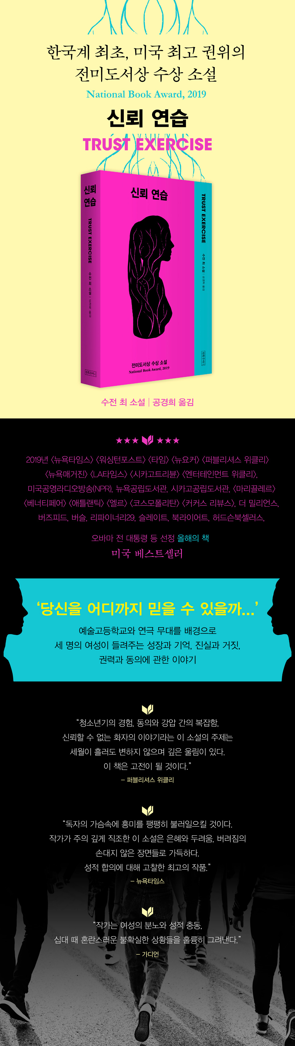 전작 소설 중 세 권이 국내에 번역, 출간된 바 있는 한국계 미국 작가 수전 최. 작가는 다섯 번째 장편소설인 이 책 《신뢰 연습》으로, 미국 문단에서 최고 권위를 지닌 전미도서상(National Book Award) 소설상을 한국계 최초로 수상했다. 미국의 여러 언론 및 오바마 전 대통령 등이 2019년 올해의 책으로 선정했고, 미국에서 베스트셀러가 되었다. 작가는 현재 예일대학교에서 소설 창작을 가르치는 한편, 이 소설을 직접 TV 드라마 시리즈로 각색 중이다.