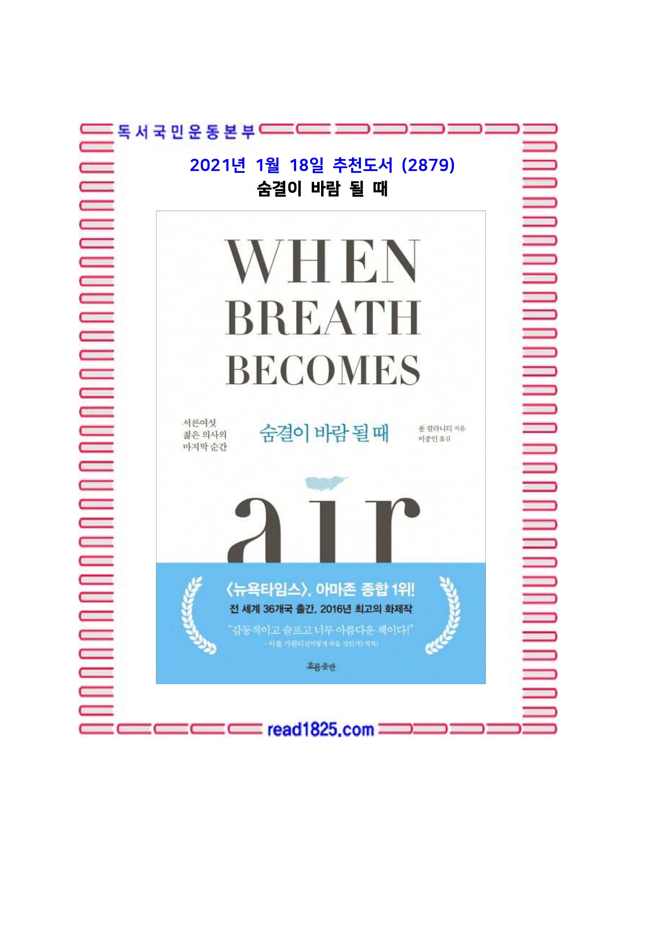 서른여섯, 전문의를 앞둔 신경외과 레지던트 마지막 해. 하루 열네 시간씩 이어지는 혹독한 수련 생활 끝에 원하는 삶이 손에 잡힐 것 같던 바로 그때 맞닥뜨린 폐암 4기 판정. 『숨결이 바람 될 때』는 신경외과 의사로서 치명적인 뇌 손상 환자들을 치료하며 죽음과 싸우던 저자가 자신도 폐암 말기 판정을 받고 죽음을 마주하게 된 마지막 2년의 기록을 담은 책이다.