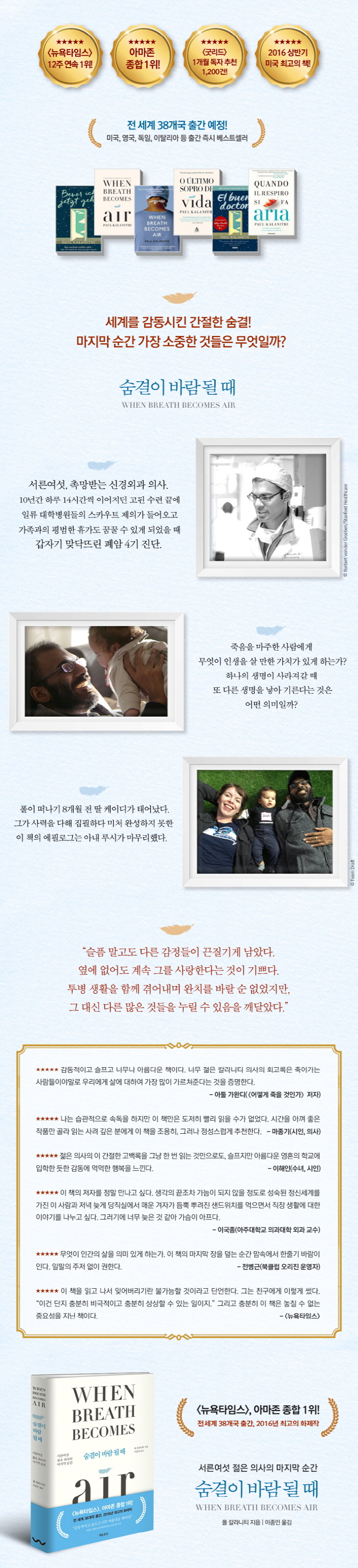 서른여섯, 전문의를 앞둔 신경외과 레지던트 마지막 해. 하루 열네 시간씩 이어지는 혹독한 수련 생활 끝에 원하는 삶이 손에 잡힐 것 같던 바로 그때 맞닥뜨린 폐암 4기 판정. 『숨결이 바람 될 때』는 신경외과 의사로서 치명적인 뇌 손상 환자들을 치료하며 죽음과 싸우던 저자가 자신도 폐암 말기 판정을 받고 죽음을 마주하게 된 마지막 2년의 기록을 담은 책이다.