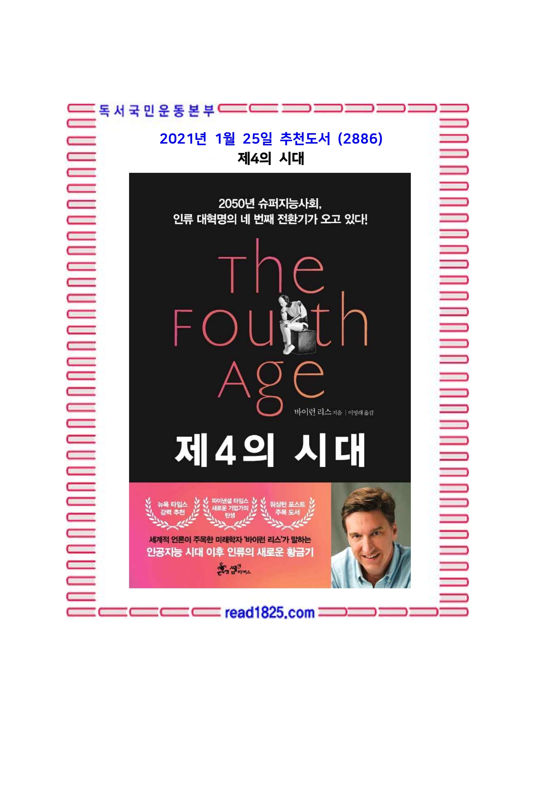 〈뉴욕 타임스〉, 〈파이낸셜 타임스〉, 〈워싱턴 포스트〉, 〈퍼블리셔 위클리〉 등 세계적 언론이 주목한 미래학자 바이런 리스는 이러한 질문이 모두 잘못되었다고 단호히 말한다. “로봇이 인간에게 빼앗아갈 직업은 무엇일까?’라는 질문에서 시작한다면 혼란만 일어날 뿐.”이라고 지적하며 트랜지스터, 뉴런, 알고리즘, AI를 논하기 전에 먼저 현실, 인간성, 정신의 본질이 무엇인지, 궁극적으로 ‘인간이란 무엇인가?’라는 질문에 먼저 답해야 한다는 것. 《제4의 시대》는 지난 10만 년의 인류 역사를 근거로 그동안 우리 삶을 근본적으로 바꾸어온 기술들과 사람들이 그를 어떻게 받아들이고 다음 시대로 나아갔는지를 설명하며, 우리 스스로 어떤 신념을 가지고 제4의 시대를 판단하고 대처해야 하는지 알려준다.