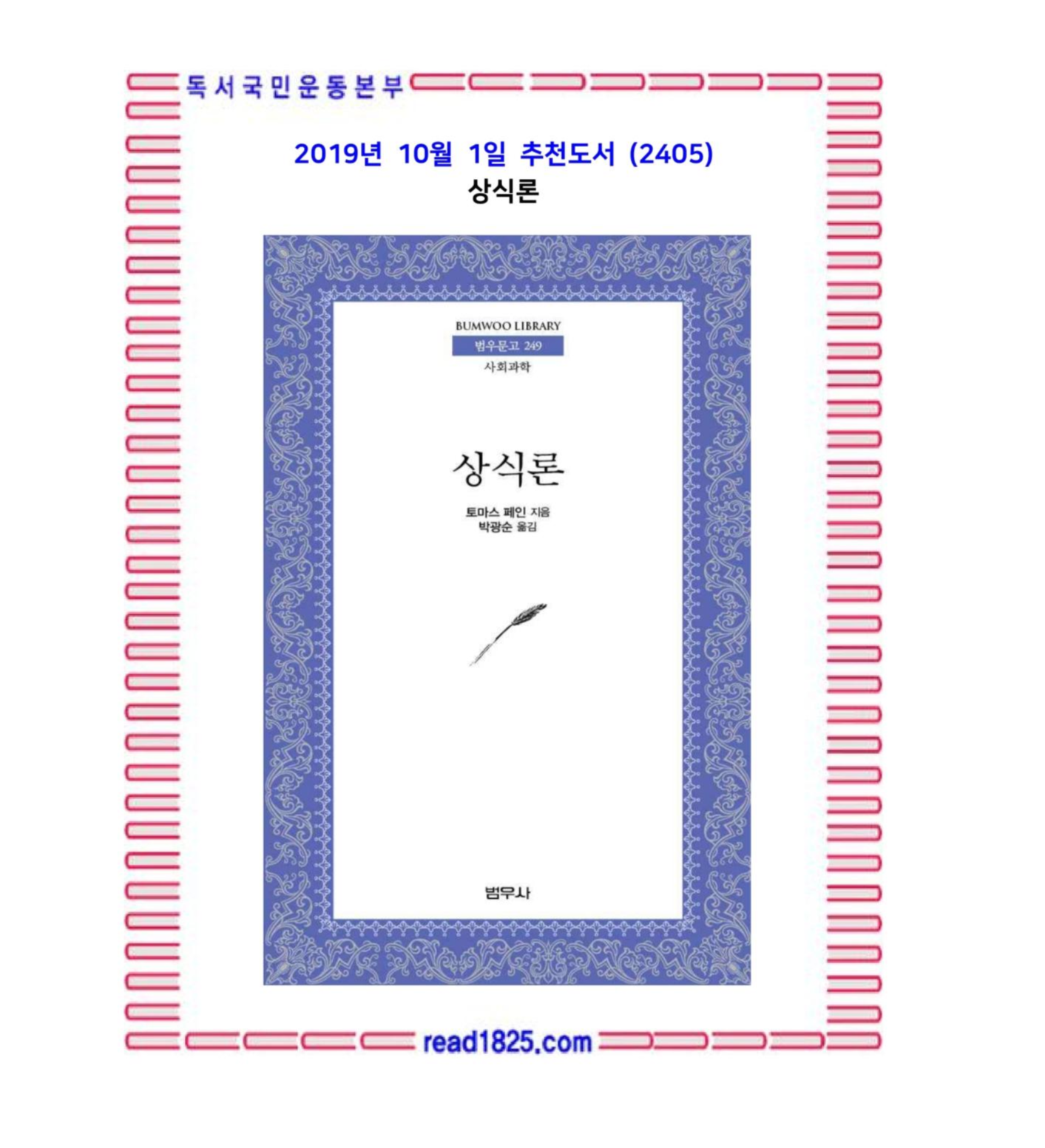 고전은 오랜 세월 동안 의미와 향기가 퇴색하지 않은 문헌을 가리킨다. 쉽게 말해 ‘오래되었으나 좋은 책’이라는 뜻이다. 하지만 고전은 대부분 수백 년 전 다른 환경에서 생겨난 문헌이기 때문에 ‘지금 여기’와는 시공간적 차이가 크다. 바로 이 점에 고전 읽기의 특징이 있다. 모든 고전은 이중적 독해가 가능하다. 한편으로 고전은 ‘오래된 책’이기에 역사서와 같은 성격을 가진다. 그러나 다른 한편으로는 ‘좋은 책’이기에 지금 여기와 무관하면 안 된다. 무릇 고전이라면 이 두 가지 측면을 다 갖추고 있겠지만, 독해하는 데 따라서는 어느 측면이 특별히 더 부각될 수도 있다. 지금 우리에게 토머스 페인의 이 고전이 단순한 고전에 그치지 않는다는 것은 어찌 보면 불행한 일이다. 시간적으로도 수백 년이나 지났고 공간적으로도 우리와 먼 아메리카 대륙을 무대로 한 고전이 지금 우리에게 그냥 고전이 아니라 중요한 ‘이론서’의 구실을 한다면 도대체 지금까지 우리는 뭘 한 걸까?