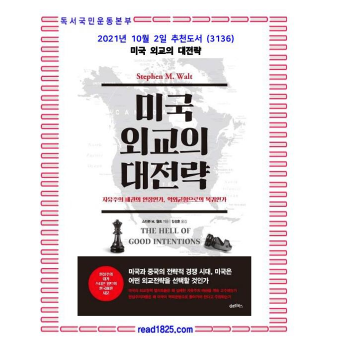 〈미국 외교의 대전략(The Hell of Good Intentions)〉의 저자인 스티븐 월트 하버드 대학 국제정치학 교수는 시카고 대학의 존 미어샤이머 교수와 함께 대표적인 국제정치 현실주의 이론가이다. 그는 이 책에서 탈냉전기 미국 외교가 “자유주의 패권”이라는 잘못된 대전략을 채택함으로써 참담한 “실패”를 겪어야 했다고 규정하면서, 거듭한 실패에도 불구하고 25년 이상 지속되어온 원인이 무엇이고 그에 대한 대안은 무엇인지를 제시한다. 월트 교수는 미국이 자유주의 패권을 폐기하고 절제된 외교정책, 구체적으로 미국의 오랜 대전략인 역외균형으로 돌아가야 하고, 결국 돌아가게 될 것이라고 주장한다.