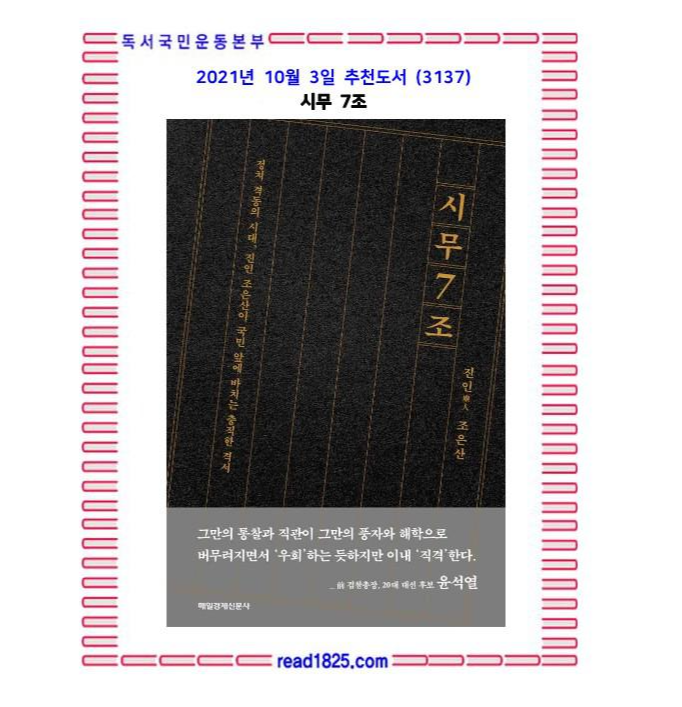 청와대를 뒤흔든 상소문의 주역 조은산. 그가 게시판에서 다 하지 못한 이야기를 책으로 담아냈다. 청와대 게시판에 올린 상소문과 같은 제목의 《시무 7조》는 그의 첫 번째 책이다. 조은산이라는 필명의 외피를 쓴 저자는 평범한 30대 가장으로, 우리나라 정치와 사회의 비상식과 불의에 맞서며 처절하게 하루하루를 살아가고 있는 서민이다. 이 책은 그런 그의 내면의 이야기를 진솔하게 담은 에세이와 풍자와 해학이 어우러진 단편 글, 현 정부에 직언하는 국민청원 상소문과 못 다한 상소문의 뒷이야기를 엮었다.