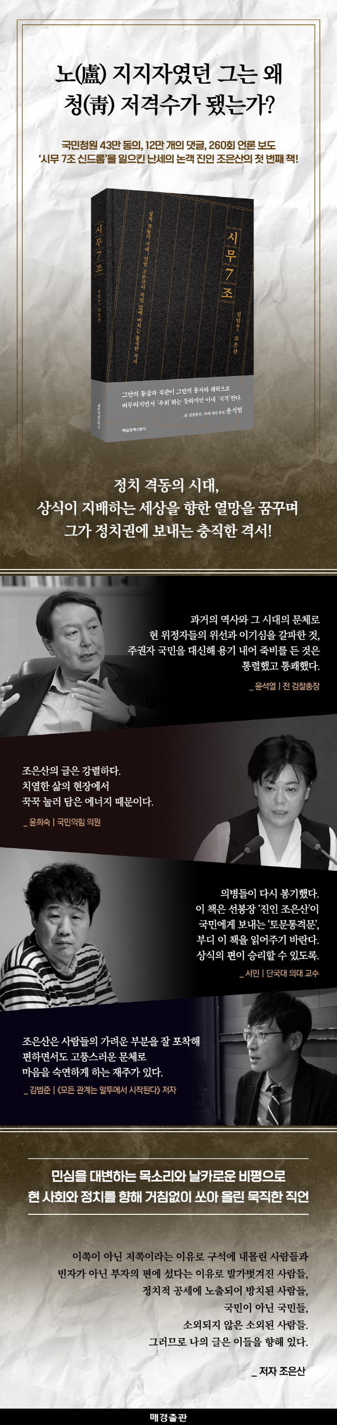 2020년 8월, 청와대 국민청원 게시판에 ‘시무 7조를 주장하는 상소를 올리니 굽어살펴주시옵소서’라는 글을 올려 43만의 동의를 얻으며 폭발적 반응을 이끌어낸 진인 조은산이 저자가 되어 독자들과 만난다. 당시 21세기형 상소문으로 “한쪽으로 안 치우치고 문제만 잘 짚었다”, “저런 사람이 정치해야 하는 거 아니냐”와 같은 호평과 함께 누리꾼과 언론의 주목을 받은 그는, 이후에도 꾸준히 블로그에 글을 써오고 있으나 온라인상에서는 할 수 있는 말이 제한되어 있다고 느끼고, 못다 한 이야기를 책으로 풀어내기로 마음먹었다.