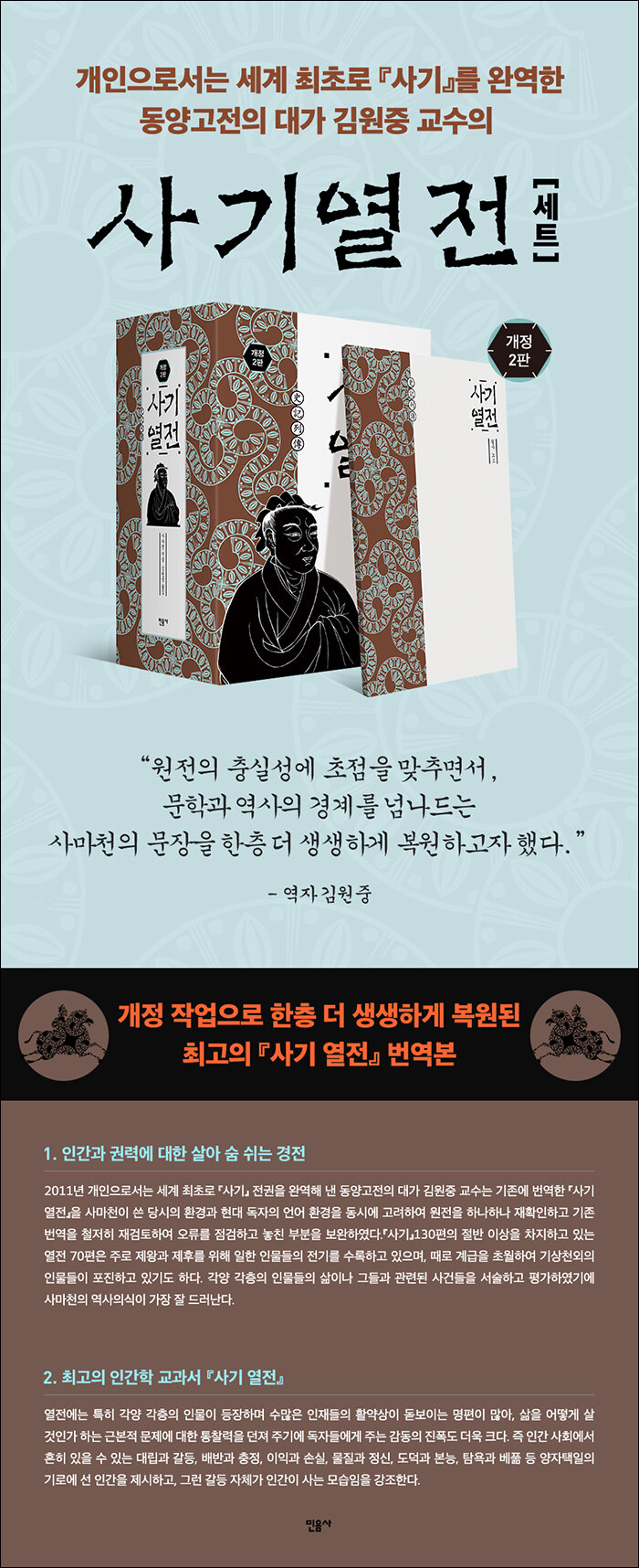 대표적 인문학 스테디셀러로서 판과 쇄를 거듭하며 많은 독자들의 사랑을 받아 온 김원중 교수의 『사기 열전』이 개정2판으로 민음사에서 다시금 출간되었다. 2011년 개인으로서는 세계 최초로 『사기』 전권을 완역해 낸 동양고전의 대가 김원중 교수는 기존에 번역한 『사기 열전』을 사마천이 쓴 당시의 환경과 현대 독자의 언어 환경을 동시에 고려하여 원전을 하나하나 재확인하고 기존 번역을 철저히 재검토하여 오류를 점검하고 놓친 부분을 보완하였다.