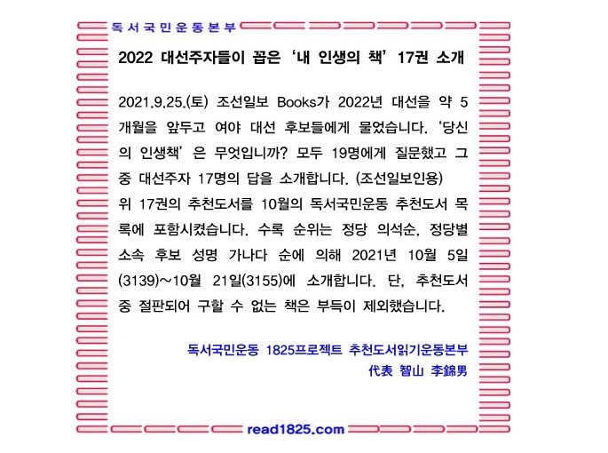 | 10월의 추천도서 (3141) 2022 대선주자 '내 인생의 책' 03 인간의 품격 (0) | 2021.10.07 |