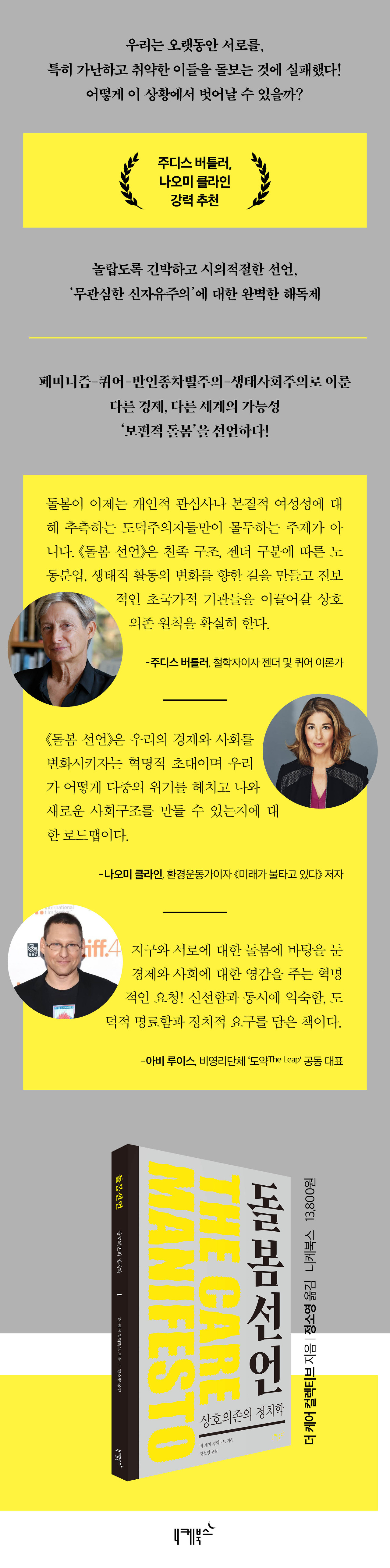 마침내 돌봄이 전 지구적 관행과 제도들을 바꾸고 우리의 세상을 변모시키는 데 있어서 얼마나 강력할 수 있는지 또 그래야만 하는지를 보여주는 《돌봄 선언》이 나왔다. 돌봄이 이제는 개인적 관심사나 본질적 여성성에 대해 추측하는 도덕주의자들만이 몰두하는 주제가 아니다. 《돌봄 선언》은 돌봄을 신자유주의 이윤 추구에 대한 신선한 비판의 형식으로 제시한다. 《돌봄 선언》은 친족 구조, 젠더 구분에 따른 노동분업, 생태적 활동의 변화를 향한 길을 만들고 진보적인 초국가적 기관들을 이끌어갈 상호의존 원칙을 확실히 한다. 더 케어 켈렉티브는 돌봄 위기의 시대에 설득력 있는 명료함과 비판적 숙고의 역량을 담은 글로 돌봄이 복잡한 역사와 희망찬 미래를 가지고 온다는 것을 상기시킨다. 그들이 지적한 것처럼 옛 영어 caru의 의미 중에는 보살핌, 근심, 걱정, 슬픔, 애통, 괴로움이 포함되어 있는데 우리 시대와 공명하는 단어들이다. 돌봄은 우리 시대를 위한 희망의 정치를 계획하고 그에 생기를 불어넣으며 우리의 삶을 다른 사람들의 삶과 불가분의 관계로 연결한다.