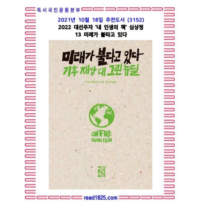 세계적인 환경운동가이자 베스트셀러 작가 나오미 클라인이 지난 기후 위기의 10년과 〈그린 뉴딜〉이 만들어갈 새로운 세상을 이야기한다. 『미래가 불타고 있다On Fire』는 기후 운동의 바이블로 평가받는 『이것이 모든 것을 바꾼다』 이후 클라인이 5년 만에 기후 변화를 주제로 쓴 책이다. 그는 이 책에서 두 번의 10년을 이야기한다. 우리가 허비한 10년(기후 위기가 잠재적 위협에서 절박한 비상사태로 변하기까지)과 우리에게 남은 10년(기후 붕괴 추세를 되돌릴 수 있는 임계점까지). 그리고 그린 뉴딜이 인류에게 남은 마지막 기회라고 강조한다.