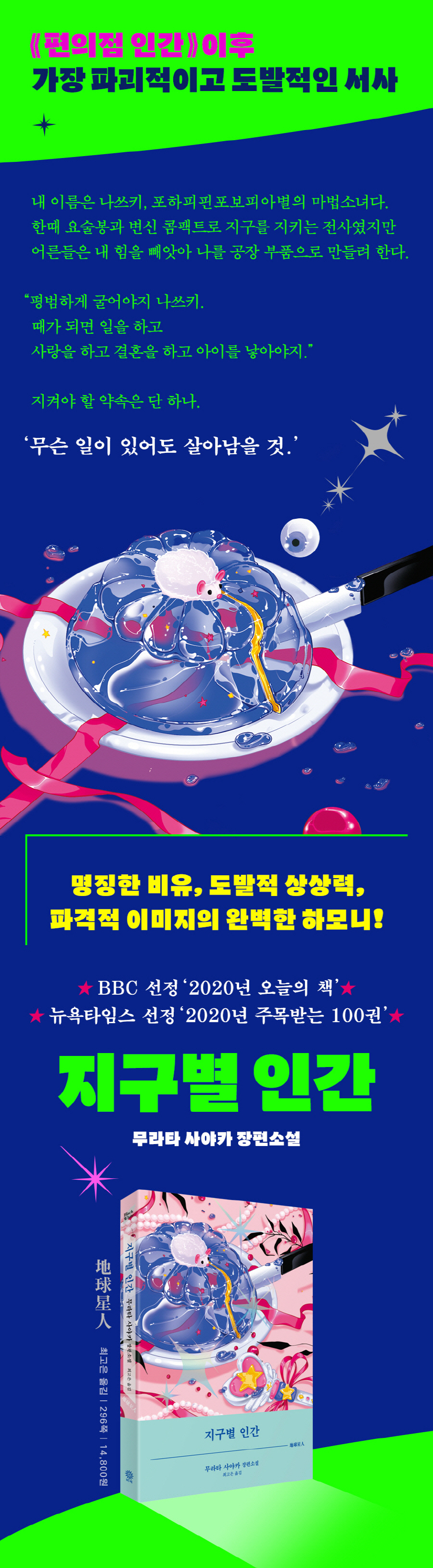 아쿠타가와상 수상 이후 단 일 년 만에 완성한 것으로 알려져 놀라움을 선사한 《지구별 인간》은 강렬한 이미지를 활용, 읽는 이를 단숨에 매혹한다. 파란 덩어리의 인간, 금빛 액체로 된 피, 핑크색 세상…. 현실의 고통이 극심할수록 더욱 동화적으로 구현되는 이미지는 독자를 기묘한 환상 한복판으로 인도하고 책장을 넘기는 손을 멈출 수 없게 한다. 이미지의 파격적인 변주는 소설적 재미를 담보하는 데에서 한발 더 나아간다. 요술봉과 변신 콤팩트, 고슴도치 인형 등 마냥 귀엽게만 보이던 이미지 이면에 숨겨진 슬픈 현실이 드러날 때, 독자는 다양한 분위기를 아우르며 유려하게 이야기를 풀어내는 무라타 사야카 문학의 힘을 실감하게 될 것이다.