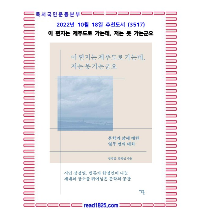 시인 장정일과 평론가 한영인이 1년여간 같은 책을 골라 읽고 메일을 주고받으며 문학과 삶에 대해 나눈 이야기를 모아 엮은 책 《이 편지는 제주도로 가는데, 저는 못 가는군요》가 안온북스에서 출간되었다. 1962년에 태어나 1984년에 시 〈강정간다〉로 등단해 1980, 90년대 한국사회와 문단을 뜨겁게 달군 시인 장정일과 1984년에 태어나 2014년부터 평론을 쓰기 시작한 평론가 한영인은 지금껏 같은 시공간을 공유하지 않은 채 서로 다른 차원에 머물렀다. 학연, 지연도 없이 세대차마저 나는 두 사람은 우연한 연유로 제주의 한 마을에 살게 되면서 서로를 알게 된다.