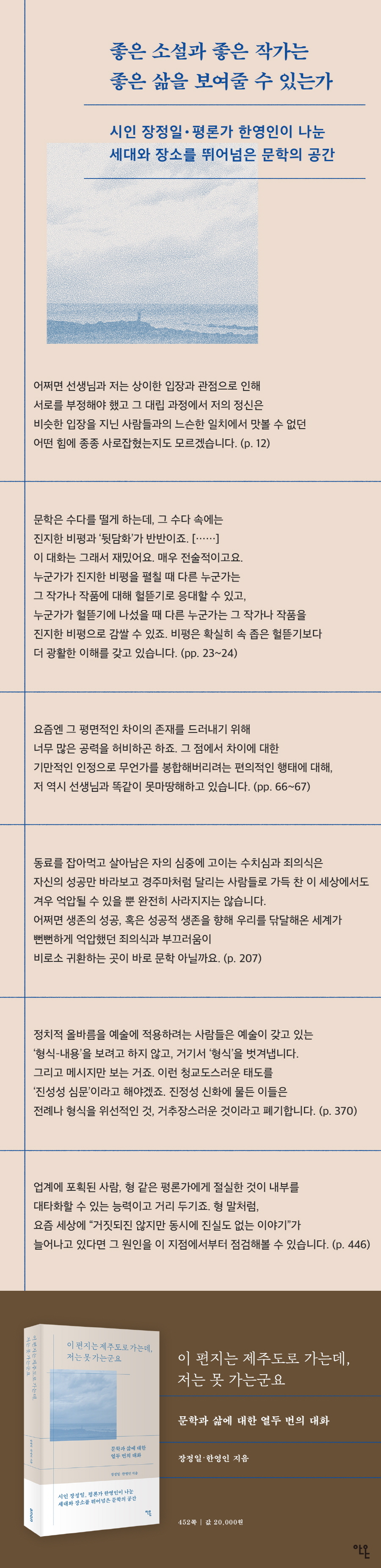 이어지는 책, 책, 책 이야기들에서 이들은 무엇을 찾고자 했을까. 서신을 통해 이야기를 이어가기로 한 이들의 제일 규칙은 ‘좋은 삶이란 무엇인가’를 주제로 삼자는 것이었다. 사계절을 넘어서는 동안 여러 문학작품을 읽고 삶에 대해 나눈 이 열두 번의 대화는 물론 ‘좋은 삶’을 정답처럼 제시하지는 않는다. 다만 그것을 누군가와 함께 찾고 있다는 안도감 그리고 그 안에서 느껴지는 즐거움이 그 답을 대신한다. 책을 매개로, 책을 딛고 진행되는 이야기, 읽고 쓰는 삶, 문학이 가능하게 하는 수다의 즐거움을 지켜보는 일은 그래서 읽는 이에게도 즐거움을 선사한다. 또한 이 책은 이들이 읽어낸 한국문학을 통해 문학이 현재의 정치·사회에 어떻게 연루되어 인간과 사회의 보존과 영속을 추구하는 과정을 담고 있는지, 우리 문학의 현주소를 이해하게 해준다. ‘책’이라는 매체는 물고 늘어질수록 더 거대하게 부풀어 올라 생명력을 더한다. 책이 가능하게 해준 이 대화의 끝에서 우리는 지금 사회를 살아갈 방법을 터득하게 된다. 무수한 책 속의 지혜를 한 권에 담은 이 책 《이 편지는 제주도로 가지만, 저는 못 가는군요》는 애서가들에게 가장 반가운 선물이 될 것이다.